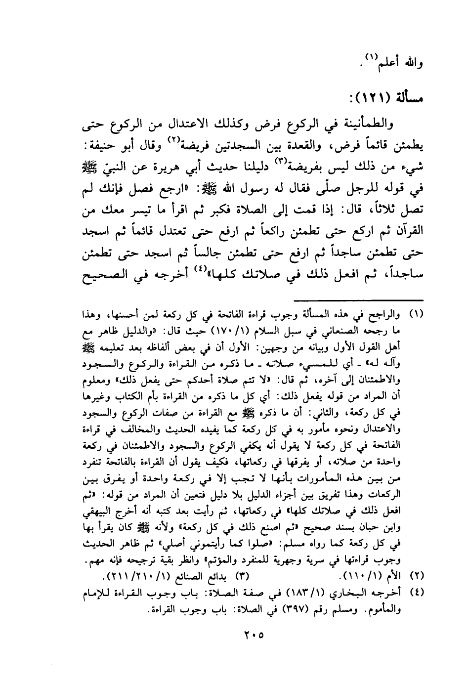 والطمأنينة فِي الرُّكُوع فرض وَكَذَلِكَ الِاعْتِدَال من الرُّكُوع حَتَّى يطمئن قَائِما فرض، والقعدة بَين السَّجْدَتَيْنِ فَرِيضَة وَقَالَ أَبُو حنيفَة: شَيْء من ذَلِك لَيْسَ بفريضة دليلنا حَدِيث أبي هُرَيْرَة عَن النَّبِي - صَلَّى اللَّهُ عَلَيْهِ وَسَلَّم َ - فِي قَوْله للرجل صلي فَقَالَ لَهُ رَسُول الله - صَلَّى اللَّهُ عَلَيْهِ وَسَلَّم َ -: " ارْجع فصل فَإنَّك لم تصل ثَلَاثًا، قَالَ: إِذا قُمْت إِلَى الصَّلَاة فَكبر ثمَّ اقْرَأ مَا تيَسّر مَعَك من الْقُرْآن ثمَّ اركع حَتَّى تطمئِن رَاكِعا ثمَّ ارْفَعْ حَتَّى تعتدل قَائِما ثمَّ اسجد حَتَّى تطمئِن سَاجِدا ثمَّ ارْفَعْ حَتَّى تطمئِن جَالِسا ثمَّ اسجد حَتَّى تطمئِن سَاجِدا، ثمَّ افْعَل ذَلِك فِي صَلَاتك كلهَا " أخرجه فِي الصَّحِيح