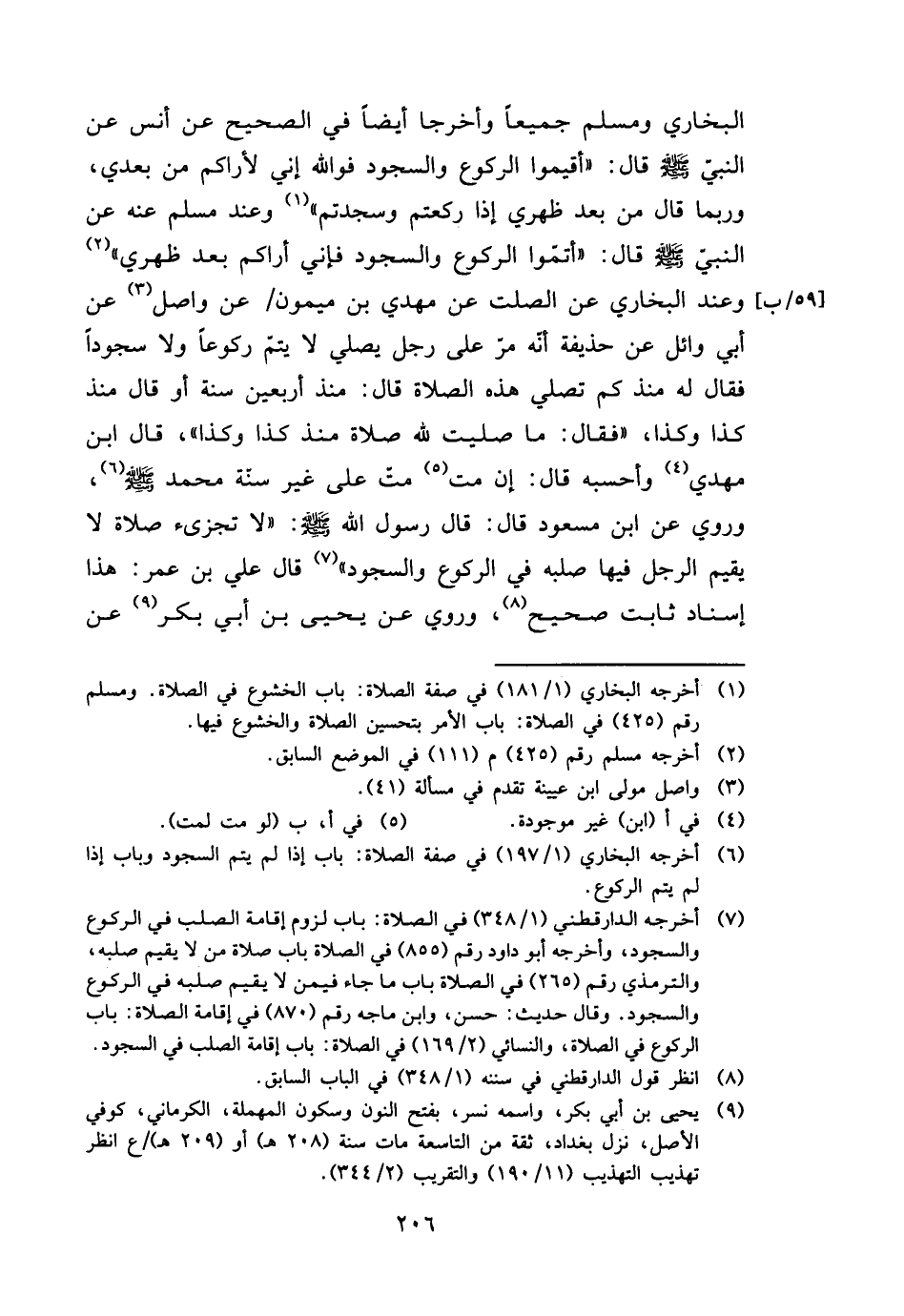 البُخَارِيّ وَمُسلم جَمِيعًا وَأَخْرَجَا أَيْضا فِي الصَّحِيح عَن أنس عَن النَّبِي - صَلَّى اللَّهُ عَلَيْهِ وَسَلَّم َ - قَالَ: " أقِيمُوا الرُّكُوع وَالسُّجُود فوَاللَّه إِنِّي لأَرَاكُمْ من بعدِي، وَرُبمَا قَالَ من بعد ظَهْري إِذا رَكَعْتُمْ وَسَجَدْتُمْ " وَعند مُسلم عَنهُ عَن النَّبِي - صَلَّى اللَّهُ عَلَيْهِ وَسَلَّم َ - قَالَ: " أَتموا الرُّكُوع وَالسُّجُود فَإِنِّي أَرَاكُم بعد ظَهْري " وَعند البُخَارِيّ عَن الصَّلْت عَن مهْدي بن مَيْمُون / عَن وَاصل عَن أبي وَائِل عَن حُذَيْفَة أَنه مر على رجل يُصَلِّي لَا يتم رُكُوعًا وَلَا سجودا فَقَالَ لَهُ مُنْذُ كم تصلي هَذِه الصَّلَاة قَالَ: مُنْذُ أَرْبَعِينَ سنة أَو قَالَ مُنْذُ كَذَا وَكَذَا، " فَقَالَ: مَا صليت لله صَلَاة مُنْذُ كَذَا وَكَذَا "، قَالَ ابْن مهْدي وَأَحْسبهُ قَالَ: إِن مت مت على غير سنة مُحَمَّد - صَلَّى اللَّهُ عَلَيْهِ وَسَلَّم َ -، وَرُوِيَ عَن ابْن مَسْعُود قَالَ: قَالَ رَسُول الله - صَلَّى اللَّهُ عَلَيْهِ وَسَلَّم َ -: " لَا تُجزئ صَلَاة لَا يُقيم الرجل فِيهَا صلبه فِي الرُّكُوع وَالسُّجُود " قَالَ عَليّ بن عمر: هَذَا إِسْنَاد ثَابت صَحِيح، وَرُوِيَ عَن يحيى بن أبي بكر عَن