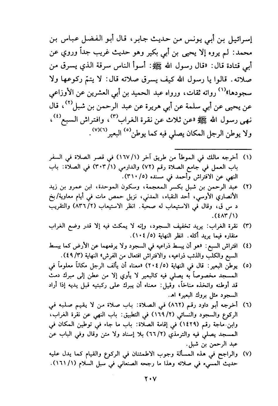 إِسْرَائِيل بن أبي يُونُس من حَدِيث جَابر، قَالَ أَبُو الْفضل عَبَّاس بن مُحَمَّد: لم يروه إِلَّا يحيى بن أبي بكير وَهُوَ حَدِيث غَرِيب جدا وَرُوِيَ عَن أبي قَتَادَة قَالَ: " قَالَ رَسُول الله - صَلَّى اللَّهُ عَلَيْهِ وَسَلَّم َ -: أَسْوَأ النَّاس سَرقَة الَّذِي يسرق من صلَاته. قَالُوا يَا رَسُول الله كَيفَ يسرق صلَاته قَالَ: لَا يتم ركوعها وَلَا سجودها " رُوَاته ثِقَات، وَرَوَاهُ عبد الحميد بن أبي الْعشْرين عَن الْأَوْزَاعِيّ عَن يحيى عَن أبي سَلمَة عَن أبي هُرَيْرَة عَن عبد الرَّحْمَن بن شبْل، قَالَ نهى رَسُول الله - صَلَّى اللَّهُ عَلَيْهِ وَسَلَّم َ - " عَن ثَلَاث عَن نقرة الْغُرَاب، وافتراش السَّبع، وَلَا يوطن الرجل الْمَكَان يُصَلِّي فِيهِ كَمَا يوطن الْبَعِير.