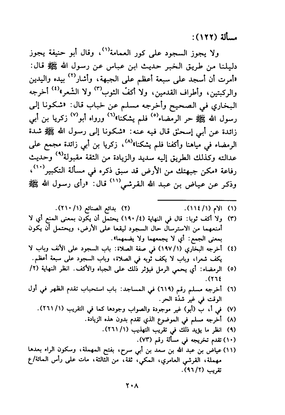 وَلَا يجوز السُّجُود على كور الْعِمَامَة، وَقَالَ أَبُو حنيفَة يجوز دليلنا من طَرِيق الْخَبَر حَدِيث ابْن عَبَّاس عَن رَسُول الله - صَلَّى اللَّهُ عَلَيْهِ وَسَلَّم َ - قَالَ: " أمرت أَن أَسجد على سَبْعَة أعظم على الْجَبْهَة، وَأَشَارَ بِيَدِهِ وَالْيَدَيْنِ والركبتين، وأطراف الْقَدَمَيْنِ، وَلَا أكف الثَّوْب وَلَا الشّعْر " أخرجه البُخَارِيّ فِي الصَّحِيح وَأخرجه مُسلم عَن خباب قَالَ: " شَكَوْنَا إِلَى رَسُول الله - صَلَّى اللَّهُ عَلَيْهِ وَسَلَّم َ - حر الرمضاء فَلم يشكنا " وَرَوَاهُ أَبُو زَكَرِيَّا بن أبي زَائِدَة عَن أبي إِسْحَق قَالَ فِيهِ عَنهُ: " شَكَوْنَا إِلَى رَسُول الله - صَلَّى اللَّهُ عَلَيْهِ وَسَلَّم َ - شدَّة الرمضاء فِي مياهنا وأكفنا فَلم يشكنا "، زَكَرِيَّا بن أبي زَائِدَة مجمع على عَدَالَته وَكَذَلِكَ الطَّرِيق إِلَيْهِ سديد وَالزِّيَادَة من الثِّقَة مَقْبُولَة وَحَدِيث رِفَاعَة " مكن جبهتك من الأَرْض قد سبق ذكره فِي مَسْأَلَة التَّكْبِير، وَذكر عَن عِيَاض بن عبد الله الْقرشِي قَالَ: " رأى رَسُول الله - صَلَّى اللَّهُ عَلَيْهِ وَسَلَّم َ -