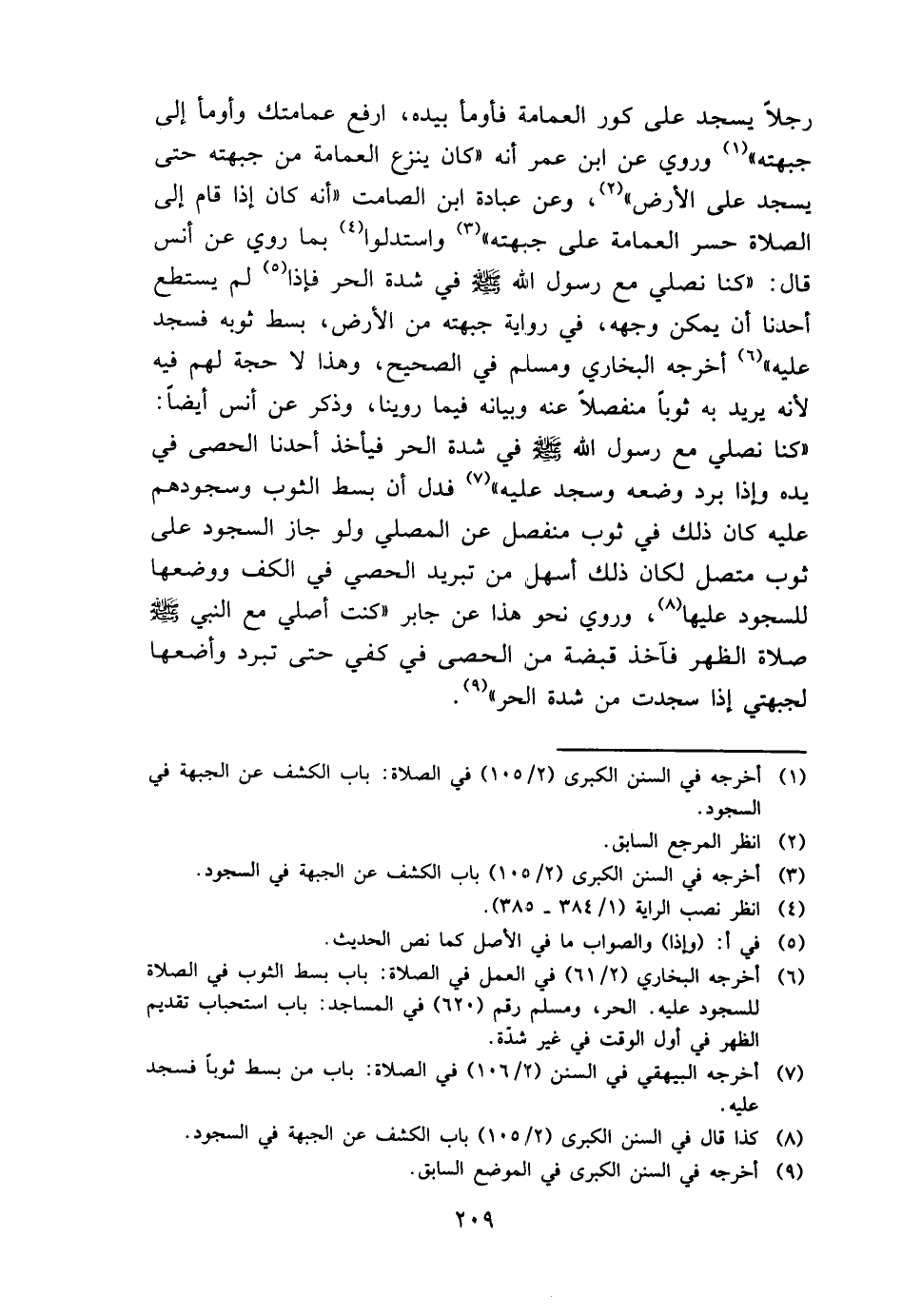رجلا يسْجد على كور الْعِمَامَة فَأَوْمأ بِيَدِهِ، ارْفَعْ عمامتك وَأَوْمَأَ إِلَى جَبهته " وَرُوِيَ عَن ابْن عمر أَنه " كَانَ ينْزع الْعِمَامَة من جَبهته حَتَّى يسْجد على الأَرْض "، وَعَن عبَادَة ابْن الصَّامِت " أَنه كَانَ إِذا قَامَ إِلَى الصَّلَاة حسر الْعِمَامَة على جَبهته " وَاسْتَدَلُّوا بِمَا رُوِيَ عَن أنس قَالَ: " كُنَّا نصلي مَعَ رَسُول الله - صَلَّى اللَّهُ عَلَيْهِ وَسَلَّم َ - فِي شدَّة الْحر فَإِذا لم يسْتَطع أَحَدنَا أَن يُمكن وَجهه، فِي رِوَايَة جَبهته من الأَرْض، بسط ثَوْبه فَسجدَ عَلَيْهِ " أخرجه البُخَارِيّ وَمُسلم فِي الصَّحِيح، وَهَذَا لَا حجَّة لَهُم فِيهِ لِأَنَّهُ يُرِيد بِهِ ثوبا مُنْفَصِلا عَنهُ وَبَيَانه فِيمَا روينَا، وَذكر عَن أنس أَيْضا: " كُنَّا نصلي مَعَ رَسُول الله - صَلَّى اللَّهُ عَلَيْهِ وَسَلَّم َ - فِي شدَّة الْحر فَيَأْخُذ أَحَدنَا الْحَصَى فِي يَده وَإِذا برد وَضعه وَسجد عَلَيْهِ " فَدلَّ أَن بسط الثَّوْب وسجودهم عَلَيْهِ كَانَ ذَلِك فِي ثوب مُنْفَصِل عَن الْمُصَلِّي وَلَو جَازَ السُّجُود على ثوب مُتَّصِل لَكَانَ ذَلِك أسهل من تبريد الحصي فِي الْكَفّ ووضعها للسُّجُود عَلَيْهَا، وَرُوِيَ نَحْو هَذَا عَن جَابر " كنت أُصَلِّي مَعَ النَّبِي - صَلَّى اللَّهُ عَلَيْهِ وَسَلَّم َ - صَلَاة الظّهْر فآخذ قَبْضَة من الْحَصَى فِي كفي حَتَّى تبرد وأضعها لجبهتي إِذا سجدت من شدَّة الْحر ".