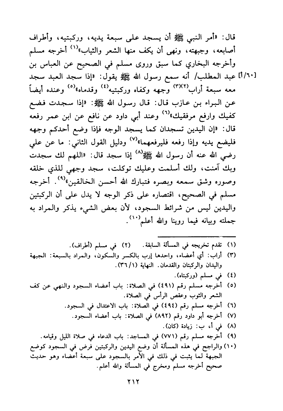 قَالَ: " أَمر النَّبِي - صَلَّى اللَّهُ عَلَيْهِ وَسَلَّم َ - أَن يسْجد على سَبْعَة يَدَيْهِ، وركبتيه، وأطراف أَصَابِعه، وجبهته، وَنهى أَن يكف مِنْهَا الشّعْر وَالثيَاب " أخرجه مُسلم وَأخرجه البُخَارِيّ كَمَا سبق وروى مُسلم فِي الصَّحِيح عَن الْعَبَّاس بن عبد الْمطلب / أَنه سمع رَسُول الله - صَلَّى اللَّهُ عَلَيْهِ وَسَلَّم َ - يَقُول: " إِذا سجد العَبْد سجد مَعَه سَبْعَة أراب وَجهه وَكَفاهُ وركبتيه وَقَدمَاهُ " وَعِنْده أَيْضا عَن الْبَراء بن عَازِب قَالَ: قَالَ رَسُول الله - صَلَّى اللَّهُ عَلَيْهِ وَسَلَّم َ -: " إِذا سجدت فضع كفيك وارفع مرفقيك " وَعند أبي دَاوُد عَن نَافِع عَن ابْن عمر رَفعه قَالَ: " إِن الْيَدَيْنِ تسجدان كَمَا يسْجد الْوَجْه فَإِذا وضع أحدكُم وَجهه فليضع يَدَيْهِ وَإِذا رَفعه فليرفعهما " وَدَلِيل القَوْل الثَّانِي: مَا عَن عَليّ رَضِي الله عَنهُ أَن رَسُول الله - صَلَّى اللَّهُ عَلَيْهِ وَسَلَّم َ - إِذا سجد قَالَ: " اللَّهُمَّ لَك سجدت وَبِك آمَنت، وَلَك أسلمت وَعَلَيْك توكلت، سجد وَجْهي للَّذي خلقه وصوره وشق سَمعه وبصره فَتَبَارَكَ الله أحسن الْخَالِقِينَ ". أخرجه مُسلم فِي الصَّحِيح، اقْتِصَاره على ذكر الْوَجْه لَا يدل على أَن الرُّكْبَتَيْنِ وَالْيَدَيْنِ لَيْسَ من شَرَائِط السُّجُود، لِأَن بعض الشَّيْء يذكر وَالْمرَاد بِهِ جملَته وَبَيَانه فِيمَا روينَا وَالله أعلم.