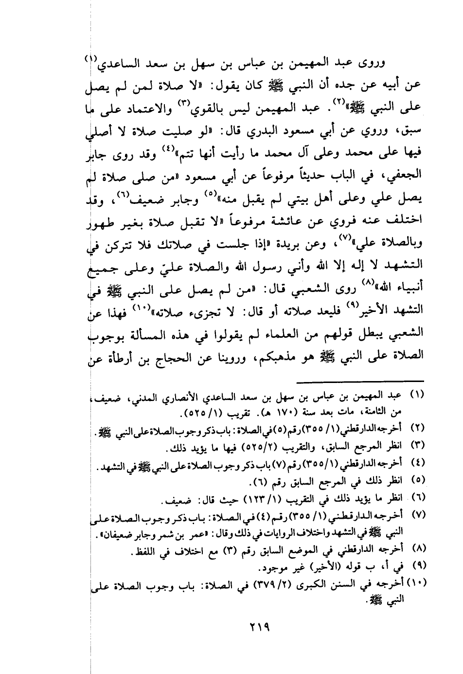 وروى عبد الْمُهَيْمِن بن عَبَّاس بن سهل بن سعد السَّاعِدِيّ عَن أَبِيه عَن جده أَن النَّبِي - صَلَّى اللَّهُ عَلَيْهِ وَسَلَّم َ - كَانَ يَقُول: " لَا صَلَاة لمن لم يصل على النَّبِي - صَلَّى اللَّهُ عَلَيْهِ وَسَلَّم َ -. عبد الْمُهَيْمِن لَيْسَ بِالْقَوِيّ والاعتماد على مَا سبق، وَرُوِيَ عَن أبي مَسْعُود البدري قَالَ: " لَو صليت صَلَاة لَا أُصَلِّي فِيهَا على مُحَمَّد وعَلى آل مُحَمَّد مَا رَأَيْت أَنَّهَا تتمّ " وَقد روى جَابر الْجعْفِيّ، فِي الْبَاب حَدِيثا مَرْفُوعا عَن أبي مَسْعُود " من صلى صَلَاة لم يصل عَليّ وعَلى أهل بَيْتِي لم يقبل مِنْهُ " وَجَابِر ضَعِيف، وَقد اخْتلف عَنهُ فَروِيَ عَن عَائِشَة مَرْفُوعا " لَا تقبل صَلَاة بِغَيْر طهُور وبالصلاة عَليّ "، وَعَن بُرَيْدَة " إِذا جَلَست فِي صَلَاتك فَلَا تتركن فِي التَّشَهُّد لَا إِلَه إِلَّا الله وَأَنِّي رَسُول الله وَالصَّلَاة عَليّ وعَلى جَمِيع أَنْبيَاء الله " روى الشّعبِيّ قَالَ: " من لم يصل على النَّبِي - صَلَّى اللَّهُ عَلَيْهِ وَسَلَّم َ - فِي التَّشَهُّد الْأَخير فليعد صلَاته أَو قَالَ: لَا تُجزئ صلَاته " فَهَذَا عَن الشّعبِيّ يبطل قَوْلهم من الْعلمَاء لم يَقُولُوا فِي هَذِه الْمَسْأَلَة بِوُجُوب الصَّلَاة على النَّبِي - صَلَّى اللَّهُ عَلَيْهِ وَسَلَّم َ - هُوَ مذهبكم، وروينا عَن الْحجَّاج بن أَرْطَأَة عَن