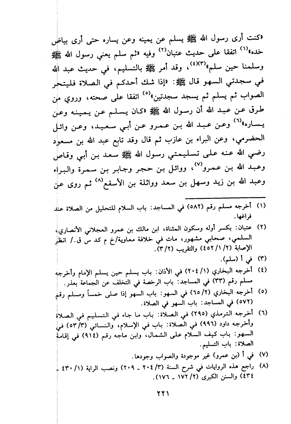 " كنت أرى رَسُول الله - صَلَّى اللَّهُ عَلَيْهِ وَسَلَّم َ - يسلم عَن يَمِينه وَعَن يسَاره حَتَّى أرى بَيَاض خَدّه " اتفقَا على حَدِيث عتْبَان وَفِيه " ثمَّ سلم يَعْنِي رَسُول الله - صَلَّى اللَّهُ عَلَيْهِ وَسَلَّم َ - وَسلمنَا حِين سلم "، وَقد أَمر - صَلَّى اللَّهُ عَلَيْهِ وَسَلَّم َ - بِالتَّسْلِيمِ، فِي حَدِيث عبد الله فِي سَجْدَتي السَّهْو قَالَ - صَلَّى اللَّهُ عَلَيْهِ وَسَلَّم َ -: " إِذا شكّ أحدكُم فِي الصَّلَاة فليتحر الصَّوَاب ثمَّ يسلم ثمَّ يسْجد سَجْدَتَيْنِ " اتفقَا على صِحَّته، وَرُوِيَ من طرق عَن عبد الله أَن رَسُول الله - صَلَّى اللَّهُ عَلَيْهِ وَسَلَّم َ - " كَانَ يسلم عَن يَمِينه وَعَن يسَاره " وَعَن عبد الله بن عَمْرو عَن أبي سعيد، وَعَن وَائِل الْحَضْرَمِيّ، وَعَن الْبَراء بن عَازِب ثمَّ قَالَ وَقد تَابع عبد الله بن مَسْعُود رَضِي الله عَنهُ على تسليمتي رَسُول الله - صَلَّى اللَّهُ عَلَيْهِ وَسَلَّم َ - سعد بن أبي وَقاص وَعبد الله بن عَمْرو، وَوَائِل بن حجر وَجَابِر بن سَمُرَة والبراء وَعبد الله بن زيد وَسَهل بن سعد وواثلة بن الْأَسْقَع ثمَّ روى عَن