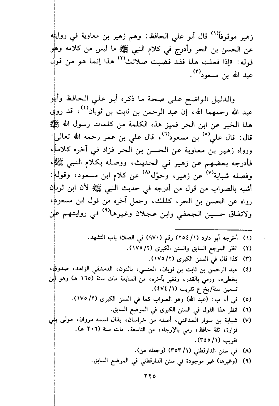 زُهَيْر مَوْقُوفا قَالَ أَبُو عَليّ الْحَافِظ: وهم زُهَيْر بن مُعَاوِيَة فِي رِوَايَته عَن الْحسن بن الْحر وأدرج فِي كَلَام النَّبِي - صَلَّى اللَّهُ عَلَيْهِ وَسَلَّم َ - مَا لَيْسَ من كَلَامه وَهُوَ قَوْله: " إِذا فعلت هَذَا فقد قضيت صَلَاتك هَذَا إِنَّمَا هُوَ من قَول عبد الله بن مَسْعُود.