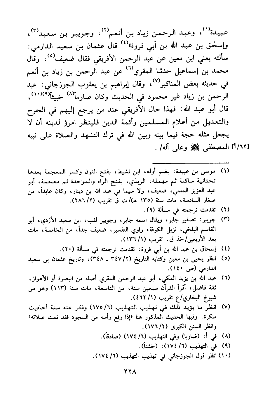 عُبَيْدَة، وَعبد الرَّحْمَن زِيَاد بن أنعم، وجويبر بن سعيد، وَإِسْحَق بن عبد الله بن أبي فَرْوَة " قَالَ عُثْمَان بن سعيد الدَّارمِيّ: سَأَلته يَعْنِي ابْن معِين عَن عبد الرَّحْمَن الأفريقي فَقَالَ ضَعِيف، وَقَالَ مُحَمَّد بن إِسْمَاعِيل حَدثنَا الْمقري عَن عبد الرَّحْمَن بن زِيَاد بن أنعم فِي حَدِيثه بعض الْمَنَاكِير، وَقَالَ إِبْرَاهِيم بن يَعْقُوب الْجوزجَاني: عبد الرَّحْمَن بن زِيَاد غير مَحْمُود فِي الحَدِيث وَكَانَ صَارِمًا خبيثا، قَالَ أَبُو عبد الله: فَهَذَا حَال الأفريقي عِنْد من يرجع إِلَيْهِم فِي الْجرْح وَالتَّعْدِيل من أَعْلَام الْمُسلمين وأئمة الدّين فَلْينْظر امْرُؤ لدينِهِ أَن لَا يَجْعَل مثله حجَّة فِيمَا بَينه وَبَين الله فِي ترك التَّشَهُّد وَالصَّلَاة على نبيه الْمُصْطَفى - صَلَّى اللَّهُ عَلَيْهِ وَسَلَّم َ - وعَلى آله /.