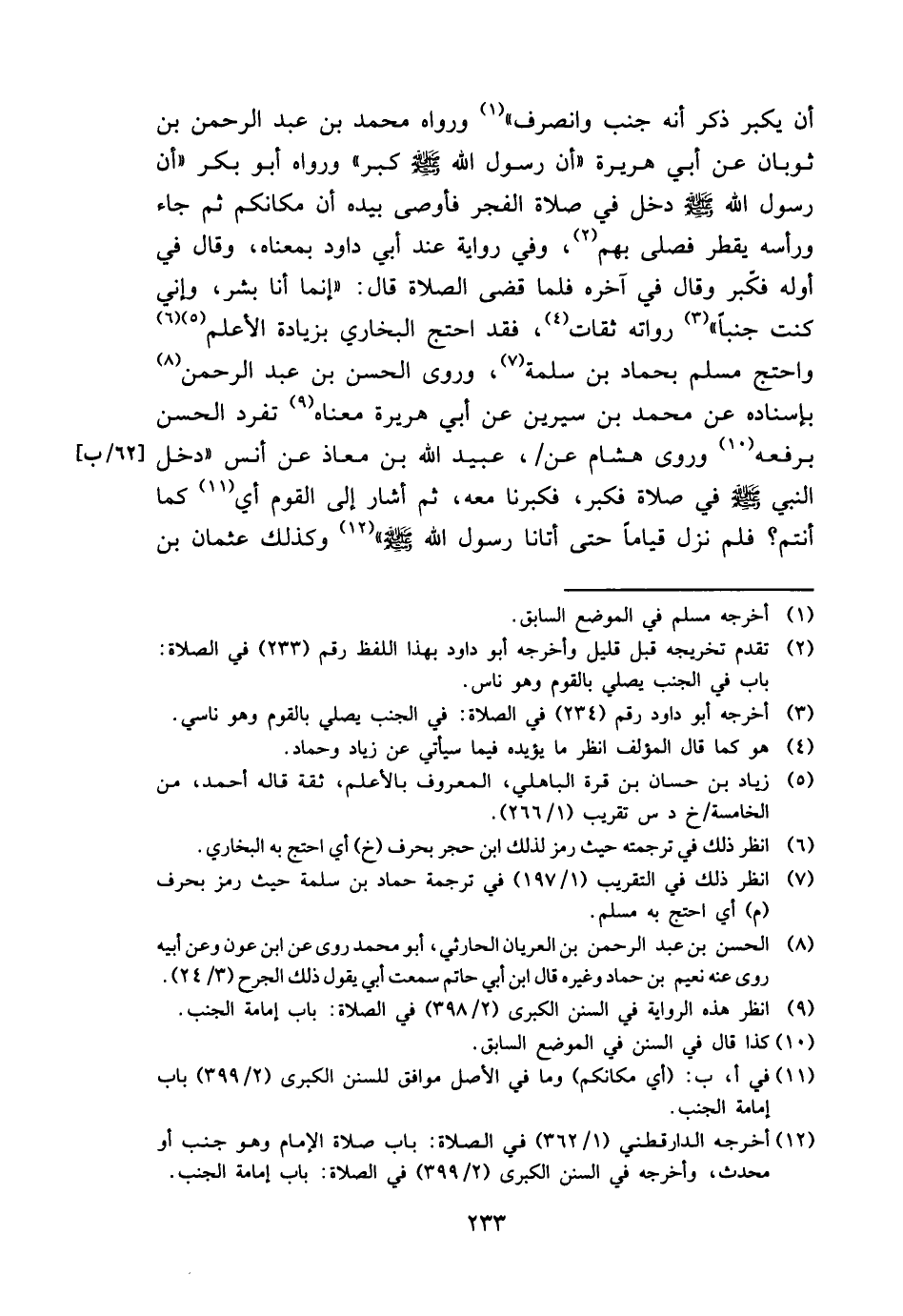 أَن يكبر ذكر أَنه جنب وَانْصَرف " وَرَوَاهُ مُحَمَّد بن عبد الرَّحْمَن بن ثَوْبَان عَن أبي هُرَيْرَة " أَن رَسُول الله - صَلَّى اللَّهُ عَلَيْهِ وَسَلَّم َ - كبر " وَرَوَاهُ أَبُو بكر " أَن رَسُول الله - صَلَّى اللَّهُ عَلَيْهِ وَسَلَّم َ - دخل فِي صَلَاة الْفجْر فأوصى بِيَدِهِ أَن مَكَانكُمْ ثمَّ جَاءَ وَرَأسه يقطر فصلى بهم، وَفِي رِوَايَة عِنْد أبي دَاوُد بِمَعْنَاهُ، وَقَالَ فِي أَوله فَكبر وَقَالَ فِي آخِره فَلَمَّا قضى الصَّلَاة قَالَ: " إِنَّمَا أَنا بشر، وَإِنِّي كنت جنبا " رُوَاته ثِقَات، فقد احْتج البُخَارِيّ بِزِيَادَة الأعلم وَاحْتج مُسلم بحماد بن سَلمَة، وروى الْحسن بن عبد الرَّحْمَن بِإِسْنَادِهِ عَن مُحَمَّد بن سِيرِين عَن أبي هُرَيْرَة مَعْنَاهُ تفرد الْحسن بِرَفْعِهِ وروى هِشَام عَن /، عبيد الله بن معَاذ عَن أنس " دخل النَّبِي - صَلَّى اللَّهُ عَلَيْهِ وَسَلَّم َ - فِي صَلَاة فَكبر، فكبرنا مَعَه، ثمَّ أَشَارَ إِلَى الْقَوْم أَي كَمَا أَنْتُم؟ فَلم نزل قيَاما حَتَّى أَتَانَا رَسُول الله - صَلَّى اللَّهُ عَلَيْهِ وَسَلَّم َ - " وَكَذَلِكَ عُثْمَان بن