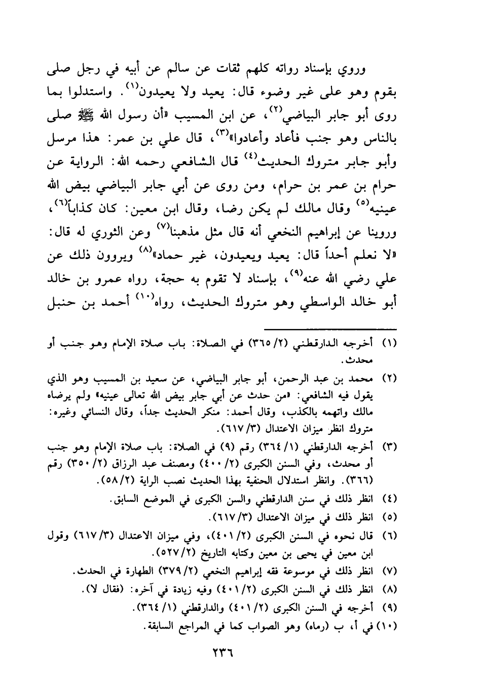 وَرُوِيَ بِإِسْنَاد رُوَاته كلهم ثِقَات عَن سَالم عَن أَبِيه فِي رجل صلى بِقوم وَهُوَ على غير وضوء قَالَ: يُعِيد وَلَا يعيدون. وَاسْتَدَلُّوا بِمَا روى أَبُو جَابر البياضي، عَن ابْن الْمسيب " أَن رَسُول الله - صَلَّى اللَّهُ عَلَيْهِ وَسَلَّم َ - صلى بِالنَّاسِ وَهُوَ جنب فَأَعَادَ وأعادوا "، قَالَ عَليّ بن عمر: هَذَا مُرْسل وَأَبُو جَابر مَتْرُوك الحَدِيث، قَالَ الشَّافِعِي رَحمَه الله: الرِّوَايَة عَن حرَام بن عمر بن حرَام، وَمن روى عَن أبي جَابر البياضي بيض الله عَيْنَيْهِ وَقَالَ مَالك لم يكن رضَا، وَقَالَ ابْن معِين: كَانَ كذابا، وروينا عَن إِبْرَاهِيم النَّخعِيّ أَنه قَالَ مثل مَذْهَبنَا وَعَن الثَّوْريّ لَهُ قَالَ: " لَا نعلم أحدا قَالَ: يُعِيد ويعيدون، غير حَمَّاد " ويروون ذَلِك عَن عَليّ رَضِي الله عَنهُ، بِإِسْنَاد لَا تقوم بِهِ حجَّة، رَوَاهُ عَمْرو بن خَالِد أَبُو خَالِد الوَاسِطِيّ وَهُوَ مَتْرُوك الحَدِيث، رَوَاهُ أَحْمد بن حَنْبَل