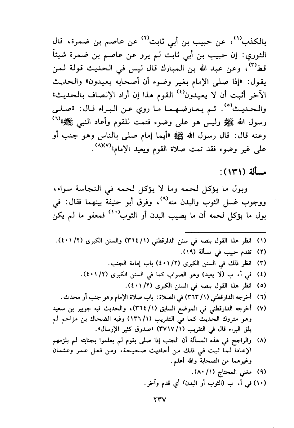 بِالْكَذِبِ، عَن حبيب بن أبي ثَابت عَن عَاصِم بن ضَمرَة، قَالَ الثَّوْريّ: إِن حبيب بن أبي ثَابت لم يرو عَن عَاصِم بن ضَمرَة شَيْئا قطّ، وَعَن عبد الله بن الْمُبَارك قَالَ لَيْسَ فِي الحَدِيث قَوْله لمن يَقُول: " إِذا صلى الإِمَام بِغَيْر وضوء أَن أَصْحَابه يعيدون " والْحَدِيث الآخر أثبت أَن لَا يعيدون الْقَوْم هَذَا إِن أَرَادَ الْإِنْصَاف بِالْحَدِيثِ " والْحَدِيث. ثمَّ يعارضهما مَا رُوِيَ عَن الْبَراء قَالَ: " صلى رَسُول الله - صَلَّى اللَّهُ عَلَيْهِ وَسَلَّم َ - وَلَيْسَ هُوَ على وضوء فتمت للْقَوْم وَأعَاد النَّبِي - صَلَّى اللَّهُ عَلَيْهِ وَسَلَّم َ - " وَعنهُ قَالَ: قَالَ رَسُول الله - صَلَّى اللَّهُ عَلَيْهِ وَسَلَّم َ - " أَيّمَا إِمَام صلى بِالنَّاسِ وَهُوَ جنب أَو على غير وضوء فقد تمت صَلَاة الْقَوْم وَيُعِيد الإِمَام ".