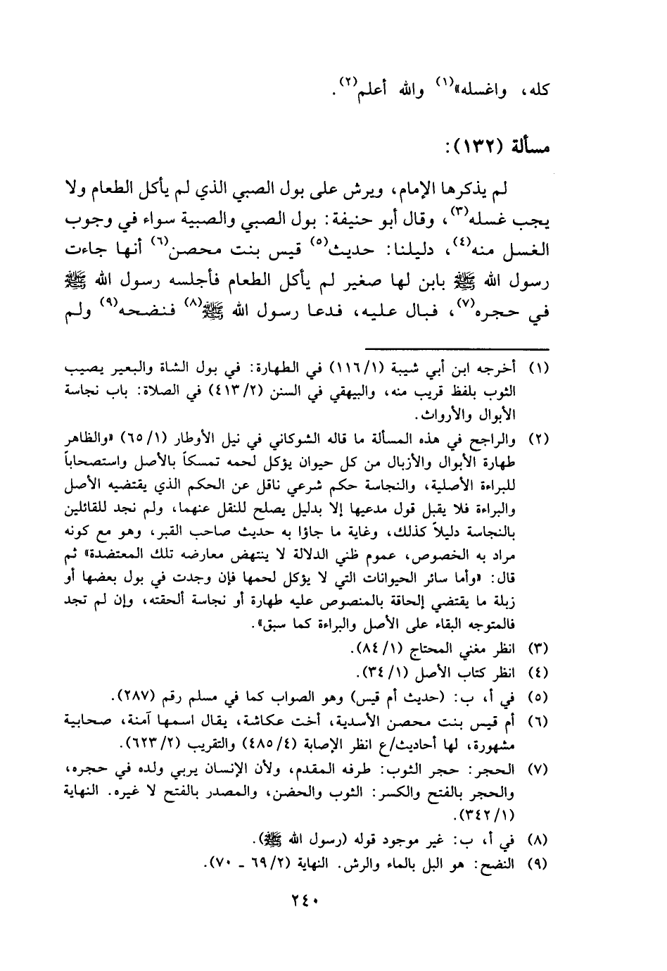 لم يذكرهَا الإِمَام، ويرش على بَوْل الصَّبِي الَّذِي لم يَأْكُل الطَّعَام وَلَا يجب غسله، وَقَالَ أَبُو حنيفَة: بَوْل الصَّبِي والصبية سَوَاء فِي وجوب الْغسْل مِنْهُ، دليلنا: حَدِيث قيس بنت مُحصن أَنَّهَا جَاءَت رَسُول الله - صَلَّى اللَّهُ عَلَيْهِ وَسَلَّم َ - بِابْن لَهَا صَغِير لم يَأْكُل الطَّعَام فأجلسه رَسُول الله - صَلَّى اللَّهُ عَلَيْهِ وَسَلَّم َ - فِي حجره، فَبَال عَلَيْهِ، فَدَعَا رَسُول الله - صَلَّى اللَّهُ عَلَيْهِ وَسَلَّم َ - فنضحه وَلم