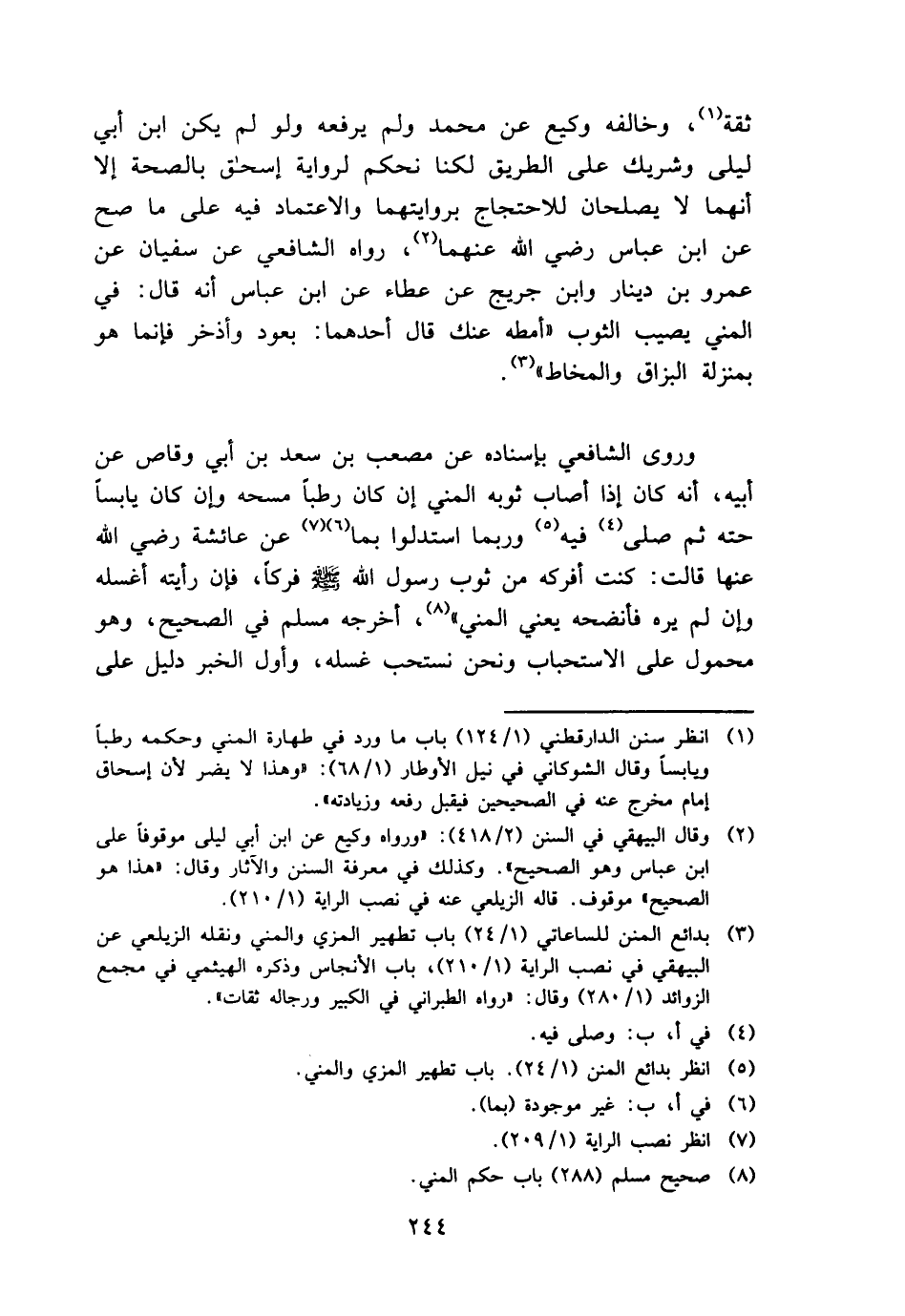 وروى الشَّافِعِي بِإِسْنَادِهِ عَن مُصعب بن سعد بن أبي وَقاص عَن أَبِيه، أَنه كَانَ إِذا أصَاب ثَوْبه الْمَنِيّ إِن كَانَ رطبا مَسحه وَإِن كَانَ يَابسا حته ثمَّ صلى فِيهِ وَرُبمَا استدلوا بِمَا عَن عَائِشَة رَضِي الله عَنْهَا قَالَت: كنت أفركه من ثوب رَسُول الله - صَلَّى اللَّهُ عَلَيْهِ وَسَلَّم َ - فركا، فَإِن رَأَيْته أغسله وَإِن لم يره فأنضحه يَعْنِي الْمَنِيّ "، أخرجه مُسلم فِي الصَّحِيح، وَهُوَ مَحْمُول على الِاسْتِحْبَاب وَنحن نستحب غسله، وَأول الْخَبَر دَلِيل على