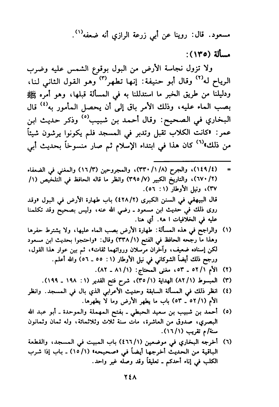 وَلَا تَزُول نَجَاسَة الأَرْض من الْبَوْل بِوُقُوع الشَّمْس عَلَيْهِ وَضرب الرِّيَاح لَهُ وَقَالَ أَبُو حنيفَة: إِنَّهَا تطهر وَهُوَ القَوْل الثَّانِي لنا، وَدَلِيلنَا من طَرِيق الْخَبَر مَا استدللنا بِهِ فِي الْمَسْأَلَة قبلهَا، وَهُوَ أمره - صَلَّى اللَّهُ عَلَيْهِ وَسَلَّم َ - بصب المَاء عَلَيْهِ، وَذَلِكَ الْأَمر بَاقٍ إِلَى أَن يحصل الْمَأْمُور بِهِ قَالَ البُخَارِيّ فِي الصَّحِيح: وَقَالَ أَحْمد بن شبيب وَذكر حَدِيث ابْن عمر: " كَانَت الْكلاب تقبل وتدبر فِي الْمَسْجِد فَلم يَكُونُوا يرشون شَيْئا من ذَلِك " كَانَ هَذَا فِي ابْتِدَاء الْإِسْلَام ثمَّ صَار مَنْسُوخا بِحَدِيث أبي