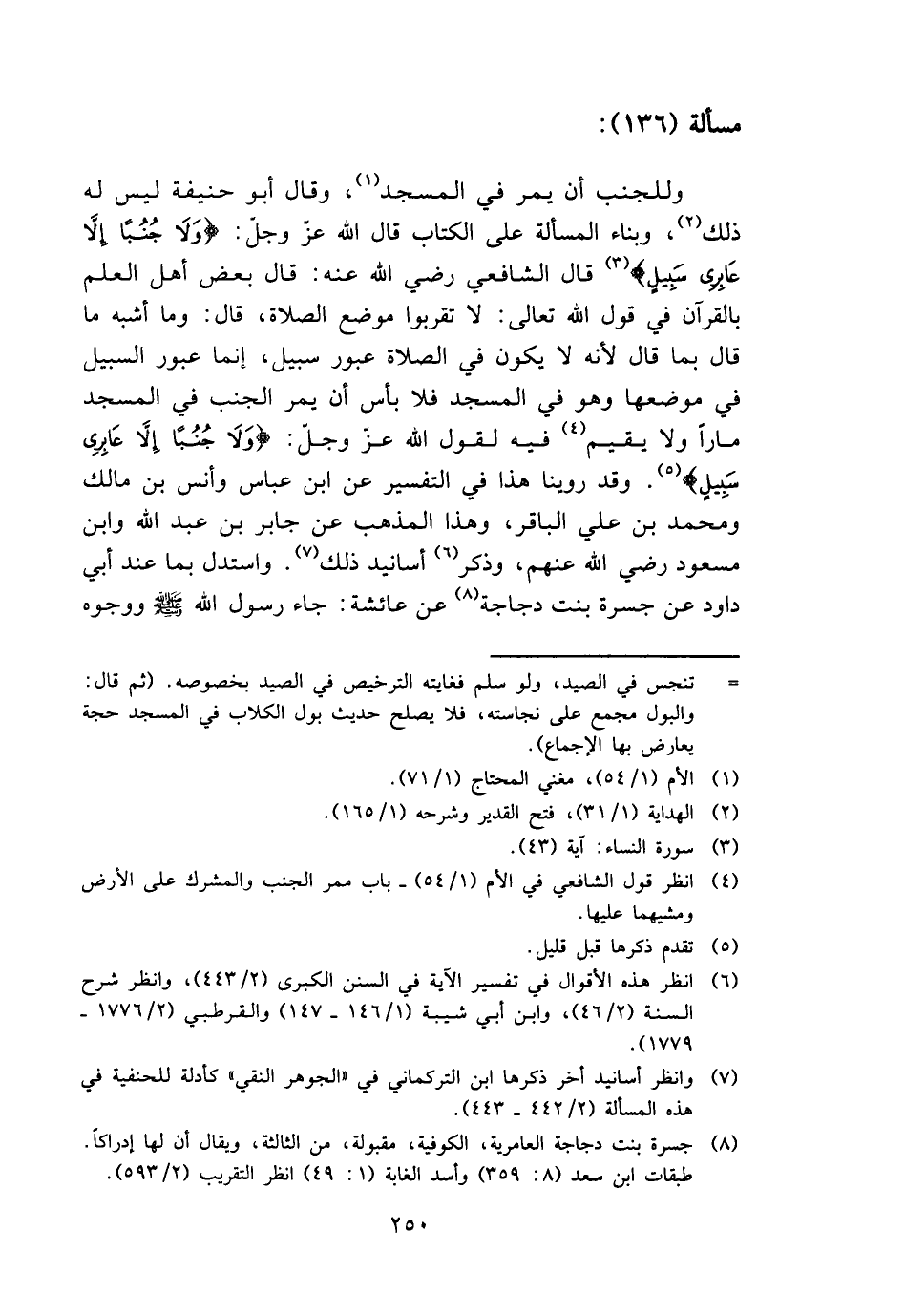 وللجنب أَن يمر فِي الْمَسْجِد، وَقَالَ أَبُو حنيفَة لَيْسَ لَهُ ذَلِك، وَبِنَاء الْمَسْأَلَة على الْكتاب قَالَ الله عز وَجل: {وَلَا جنبا إِلَّا عابري سَبِيل} قَالَ الشَّافِعِي رَضِي الله عَنهُ: قَالَ بعض أهل الْعلم بِالْقُرْآنِ فِي قَول الله تَعَالَى: لَا تقربُوا مَوضِع الصَّلَاة، قَالَ: وَمَا أشبه مَا قَالَ بِمَا قَالَ لِأَنَّهُ لَا يكون فِي الصَّلَاة عبور سَبِيل، إِنَّمَا عبور السَّبِيل فِي موضعهَا وَهُوَ فِي الْمَسْجِد فَلَا بَأْس أَن يمر الْجنب فِي الْمَسْجِد مارا وَلَا يُقيم فِيهِ لقَوْل الله عز وَجل: {وَلَا جنبا إِلَّا عابري سَبِيل} . وَقد روينَا هَذَا فِي التَّفْسِير عَن ابْن عَبَّاس وَأنس بن مَالك وَمُحَمّد بن عَليّ الباقر، وَهَذَا الْمَذْهَب عَن جَابر بن عبد الله وَابْن مَسْعُود رَضِي الله عَنْهُم، وَذكر أَسَانِيد ذَلِك. وَاسْتدلَّ بِمَا عِنْد أبي دَاوُد عَن جسرة بنت دجَاجَة عَن عَائِشَة: جَاءَ رَسُول الله - صَلَّى اللَّهُ عَلَيْهِ وَسَلَّم َ - ووجوه