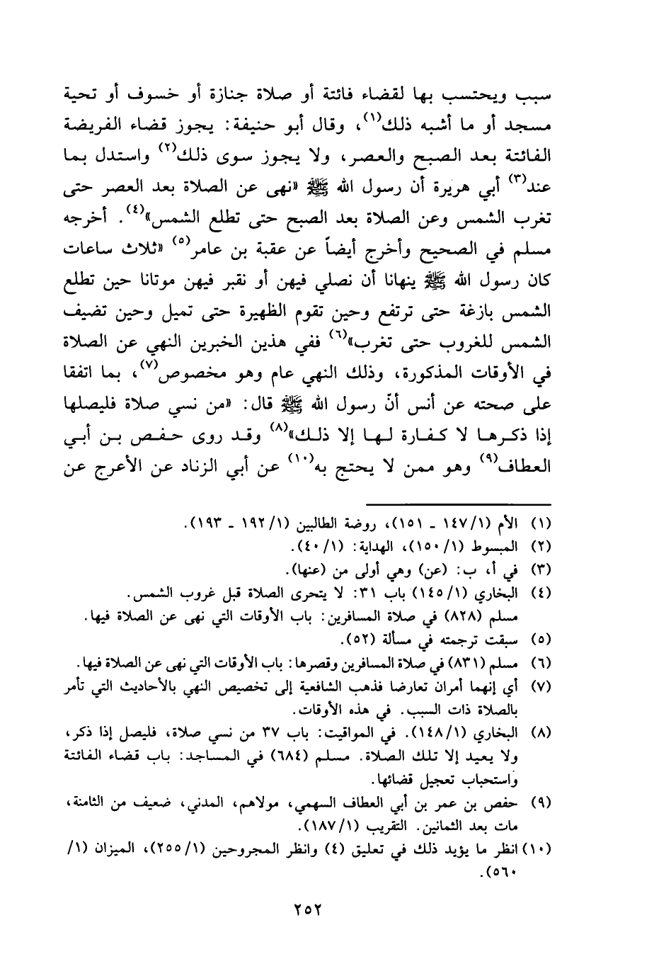 سَبَب ويحتسب بهَا لقَضَاء فَائِتَة أَو صَلَاة جَنَازَة أَو خُسُوف أَو تَحِيَّة مَسْجِد أَو مَا أشبه ذَلِك، وَقَالَ أَبُو حنيفَة: يجوز قَضَاء الْفَرِيضَة الْفَائِتَة بعد الصُّبْح وَالْعصر، وَلَا يجوز سوى ذَلِك وَاسْتدلَّ بِمَا عِنْد أبي هُرَيْرَة أَن رَسُول الله - صَلَّى اللَّهُ عَلَيْهِ وَسَلَّم َ - " نهى عَن الصَّلَاة بعد الْعَصْر حَتَّى تغرب الشَّمْس وَعَن الصَّلَاة بعد الصُّبْح حَتَّى تطلع الشَّمْس ". أخرجه مُسلم فِي الصَّحِيح وَأخرج أَيْضا عَن عقبَة بن عَامر " ثَلَاث سَاعَات كَانَ رَسُول الله - صَلَّى اللَّهُ عَلَيْهِ وَسَلَّم َ - ينهانا أَن نصلي فِيهِنَّ أَو نقبر فِيهِنَّ مَوتَانا حِين تطلع الشَّمْس بازغة حَتَّى ترْتَفع وَحين تقوم الظهيرة حَتَّى تميل وَحين تضيف الشَّمْس للغروب حَتَّى تغرب " فَفِي هذَيْن الْخَبَرَيْنِ النَّهْي عَن الصَّلَاة فِي الْأَوْقَات الْمَذْكُورَة، وَذَلِكَ النَّهْي عَام وَهُوَ مَخْصُوص، بِمَا اتفقنا على صِحَّته عَن أنس أَن رَسُول الله - صَلَّى اللَّهُ عَلَيْهِ وَسَلَّم َ - قَالَ: " من نسي صَلَاة فليصلها إِذا ذكرهَا لَا كَفَّارَة لَهَا إِلَّا ذَلِك " وَقد روى حَفْص بن أبي العطاف وَهُوَ مِمَّن لَا يحْتَج بِهِ عَن أبي الزِّنَاد عَن الْأَعْرَج عَن