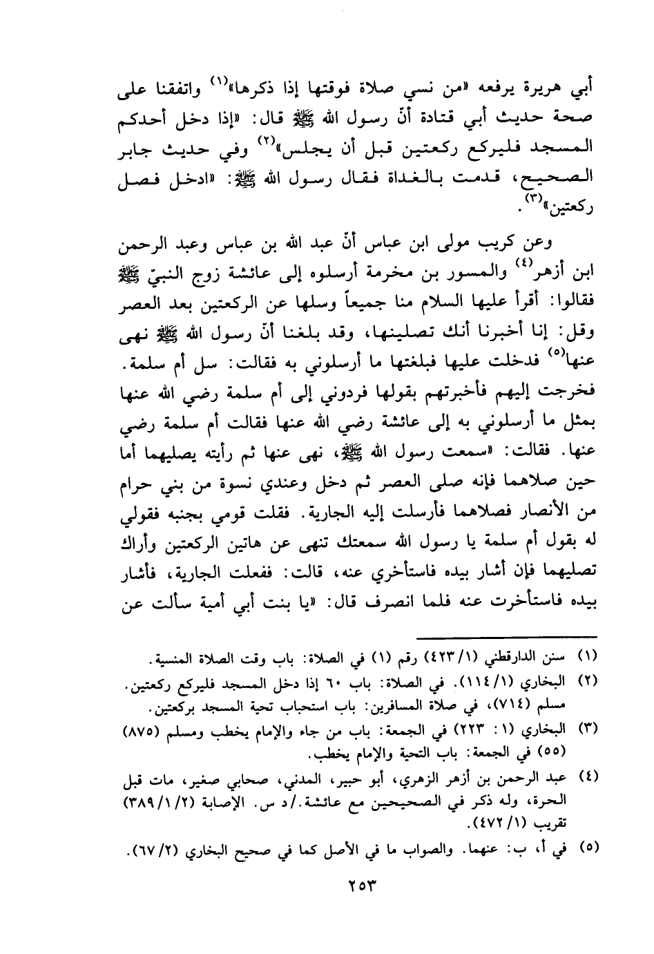 أبي هُرَيْرَة يرفعهُ " من نسي صَلَاة فوقتها إِذا ذكرهَا " واتفقنا على صِحَة حَدِيث أبي قَتَادَة أَن رَسُول الله - صَلَّى اللَّهُ عَلَيْهِ وَسَلَّم َ - قَالَ: " إِذا دخل أحدكُم الْمَسْجِد فليركع رَكْعَتَيْنِ قبل أَن يجلس " وَفِي حَدِيث جَابر الصَّحِيح، قدمت بِالْغَدَاةِ فَقَالَ رَسُول الله - صَلَّى اللَّهُ عَلَيْهِ وَسَلَّم َ -: " ادخل فصل رَكْعَتَيْنِ ".