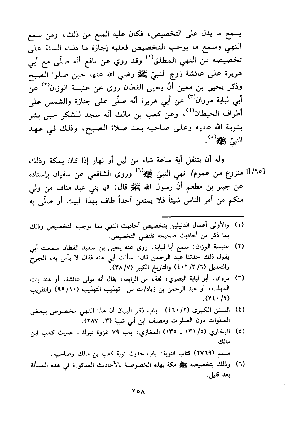 وَله أَن يتَنَفَّل أَيَّة سَاعَة شَاءَ من ليل أَو نَهَار إِذا كَانَ بِمَكَّة وَذَلِكَ منزوع من عُمُوم / نهي النَّبِي - صَلَّى اللَّهُ عَلَيْهِ وَسَلَّم َ - وروى الشَّافِعِي عَن سُفْيَان بِإِسْنَادِهِ عَن جُبَير بن مطعم أَن رَسُول الله - صَلَّى اللَّهُ عَلَيْهِ وَسَلَّم َ - قَالَ: " يَا بني عبد منَاف من ولي مِنْكُم من أَمر النَّاس شَيْئا فَلَا يمنعن أحدا طَاف بِهَذَا الْبَيْت أَو صلى بِهِ