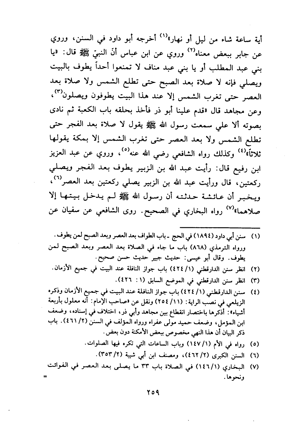 أَيَّة سَاعَة شَاءَ من ليل أَو نَهَار " أخرجه أَبُو دَاوُد فِي السّنَن، وَرُوِيَ عَن جَابر بِبَعْض مَعْنَاهُ وَرُوِيَ عَن ابْن عَبَّاس أَن النَّبِي - صَلَّى اللَّهُ عَلَيْهِ وَسَلَّم َ - قَالَ: " يَا بني عبد الْمطلب أَو يَا بني عبد منَاف لَا تمنعوا أحدا يطوف بِالْبَيْتِ وَيُصلي فَإِنَّهُ لَا صَلَاة بعد الصُّبْح حَتَّى تطلع الشَّمْس وَلَا صَلَاة بعد الْعَصْر حَتَّى تغرب الشَّمْس إِلَّا عِنْد هَذَا الْبَيْت يطوفون وَيصلونَ، وَعَن مُجَاهِد قَالَ " قدم علينا أَبُو ذَر فَأخذ بِحَلقَة بَاب الْكَعْبَة ثمَّ نَادَى بِصَوْتِهِ أَلا عَليّ سَمِعت رَسُول الله - صَلَّى اللَّهُ عَلَيْهِ وَسَلَّم َ - يَقُول لَا صَلَاة بعد الْفجْر حَتَّى تطلع الشَّمْس وَلَا بعد الْعَصْر حَتَّى تغرب الشَّمْس إِلَّا بِمَكَّة يَقُولهَا ثَلَاثًا " وَكَذَلِكَ رَوَاهُ الشَّافِعِي رَضِي الله عَنهُ، وَرُوِيَ عَن عبد الْعَزِيز ابْن رفيع قَالَ: رَأَيْت عبد الله بن الزبير يطوف بعد الْفجْر وَيُصلي رَكْعَتَيْنِ، قَالَ وَرَأَيْت عبد الله بن الزبير يُصَلِّي رَكْعَتَيْنِ بعد الْعَصْر، ويخبر أَن عَائِشَة حدثته أَن رَسُول الله - صَلَّى اللَّهُ عَلَيْهِ وَسَلَّم َ - لم يدْخل بَيتهَا إِلَّا صلاهما " رَوَاهُ البُخَارِيّ فِي الصَّحِيح. روى الشَّافِعِي عَن سُفْيَان عَن