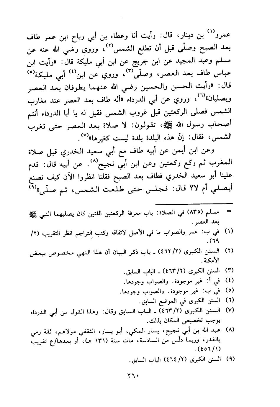 عَمْرو بن دِينَار، قَالَ: رَأَيْت أَنا وَعَطَاء بن أبي رَبَاح ابْن عمر طَاف بعد الصُّبْح وَصلى قبل أَن تطلع الشَّمْس، وروى رَضِي الله عَنهُ عَن مُسلم وَعبد الْمجِيد عَن ابْن جريج عَن ابْن أبي مليكَة قَالَ: " رَأَيْت ابْن عَبَّاس طَاف بعد الْعَصْر، وَصلى، وَرُوِيَ عَن ابْن أبي مليكَة قَالَ: " رَأَيْت الْحسن وَالْحُسَيْن رَضِي الله عَنْهُمَا يطوفان بعد الْعَصْر ويصليان "، وَرُوِيَ عَن أبي الدَّرْدَاء " أَنه طَاف بعد الْعَصْر عِنْد مغارب الشَّمْس فصلى الرَّكْعَتَيْنِ قبل غرُوب الشَّمْس فَقيل لَهُ يَا أَبَا الدَّرْدَاء أَنْتُم أَصْحَاب رَسُول الله - صَلَّى اللَّهُ عَلَيْهِ وَسَلَّم َ -، تَقولُونَ: لَا صَلَاة بعد الْعَصْر حَتَّى تغرب الشَّمْس، فَقَالَ: إِن هَذِه الْبَلدة بَلْدَة لَيست كَغَيْرِهَا ".