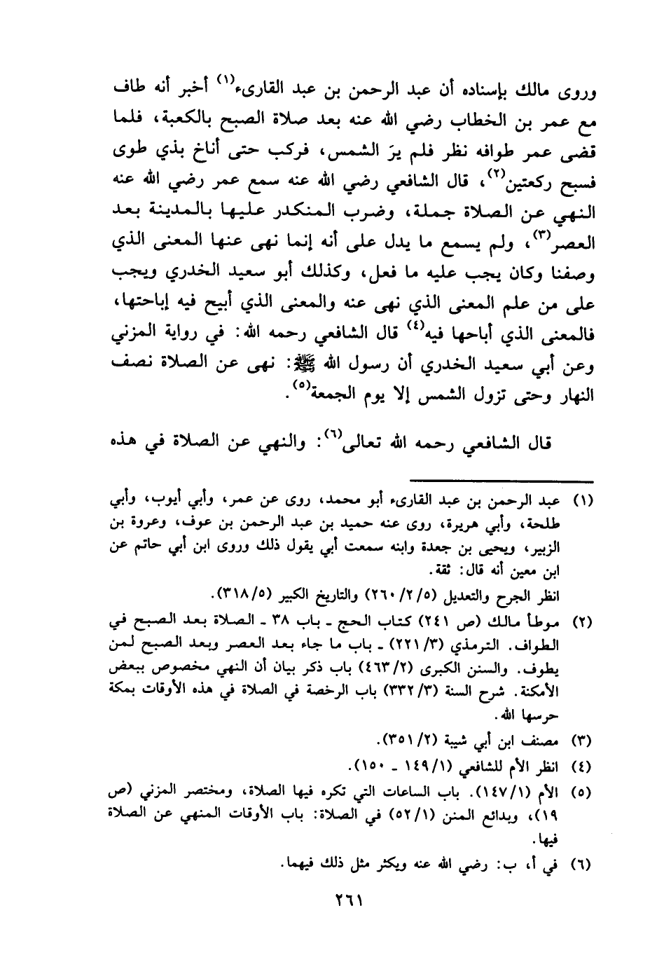وروى مَالك بِإِسْنَادِهِ أَن عبد الرَّحْمَن بن عبد الْقَارئ أخبر أَنه طَاف مَعَ عمر بن الْخطاب رَضِي الله عَنهُ بعد صَلَاة الصُّبْح بِالْكَعْبَةِ، فَلَمَّا قضى عمر طَوَافه نظر فَلم ير الشَّمْس، فَركب حَتَّى أَنَاخَ بِذِي طوى فسبح رَكْعَتَيْنِ، قَالَ الشَّافِعِي رَضِي الله عَنهُ سمع عمر رَضِي الله عَنهُ النَّهْي عَن الصَّلَاة جملَة، وَضرب الْمُنْكَدر عَلَيْهَا بِالْمَدِينَةِ بعد الْعَصْر، وَلم يسمع مَا يدل على أَنه إِنَّمَا نهى عَنْهَا الْمَعْنى الَّذِي وَصفنَا وَكَانَ يجب عَلَيْهِ مَا فعل، وَكَذَلِكَ أَبُو سعيد الْخُدْرِيّ وَيجب على من علم الْمَعْنى الَّذِي نهى عَنهُ وَالْمعْنَى الَّذِي أُبِيح فِيهِ أباحتها، فَالْمَعْنى الَّذِي أَبَاحَهَا فِيهِ قَالَ الشَّافِعِي رَحمَه الله: فِي رِوَايَة الْمُزنِيّ وَعَن أبي سعيد الْخُدْرِيّ أَن رَسُول الله - صَلَّى اللَّهُ عَلَيْهِ وَسَلَّم َ -: نهى عَن الصَّلَاة نصف النَّهَار وَحَتَّى تَزُول الشَّمْس إِلَّا يَوْم الْجُمُعَة.