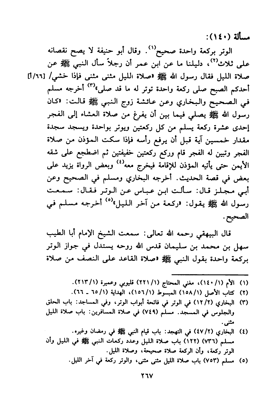 قَالَ الْبَيْهَقِيّ رَحمَه الله تَعَالَى: سَمِعت الشَّيْخ الإِمَام أَبَا الطّيب سهل بن مُحَمَّد بن سُلَيْمَان قدس الله روحه يسْتَدلّ فِي جَوَاز الْوتر بِرَكْعَة وَاحِدَة بقول النَّبِي - صَلَّى اللَّهُ عَلَيْهِ وَسَلَّم َ - " صَلَاة الْقَاعِد على النّصْف من صَلَاة