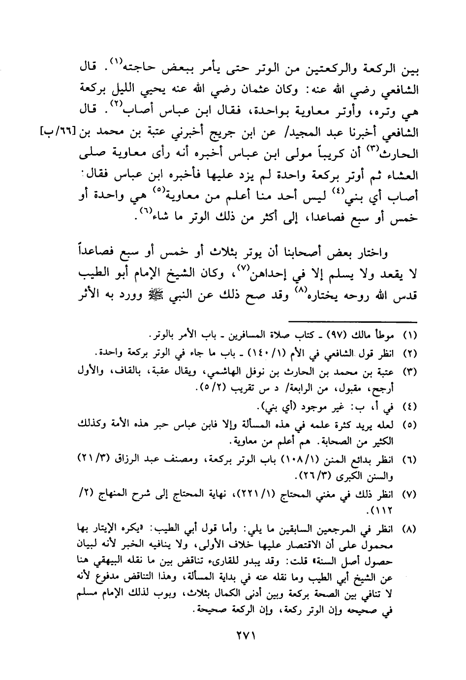 بَين الرَّكْعَة والركعتين من الْوتر حَتَّى يَأْمر بِبَعْض حَاجته. قَالَ الشَّافِعِي رَضِي الله عَنهُ: وَكَانَ عُثْمَان رَضِي الله عَنهُ يحيي اللَّيْل بِرَكْعَة هِيَ وتره، وأوتر مُعَاوِيَة بِوَاحِدَة، فَقَالَ ابْن عَبَّاس أصَاب. قَالَ الشَّافِعِي أخبرنَا عبد الْمجِيد / عَن ابْن جريج أَخْبرنِي عتبَة بن مُحَمَّد بن الْحَارِث أَن كريبا مولى ابْن عَبَّاس أخبرهُ أَنه رأى مُعَاوِيَة صلى الْعشَاء ثمَّ أوتر بِرَكْعَة وَاحِدَة لم يزدْ عَلَيْهَا فَأخْبرهُ ابْن عَبَّاس فَقَالَ: أصَاب أَي بني لَيْسَ أحد منا أعلم من مُعَاوِيَة هِيَ وَاحِدَة أَو خمس أَو سبع فَصَاعِدا، إِلَى أَكثر من ذَلِك الْوتر مَا شَاءَ.