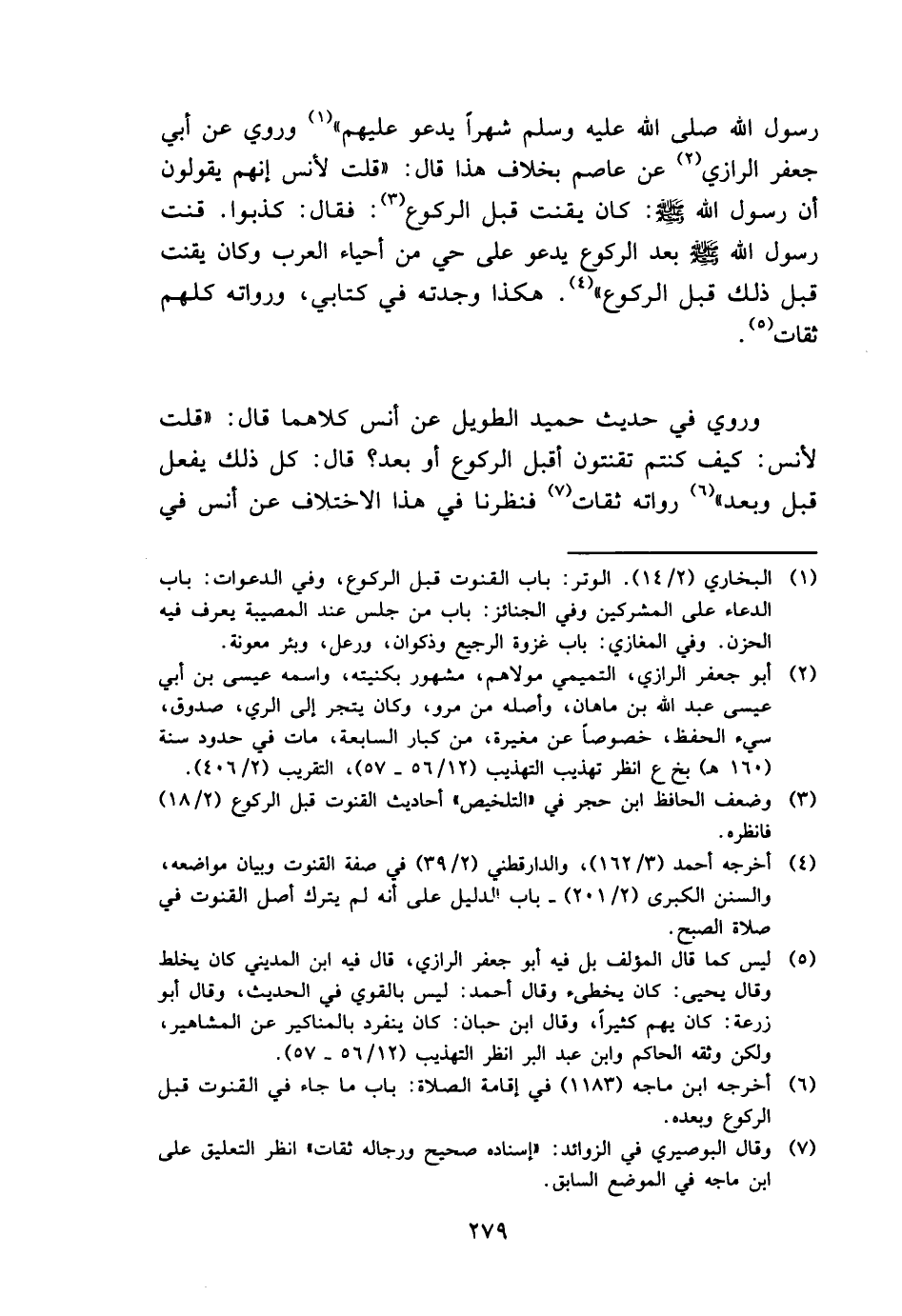 رَسُول الله - صَلَّى اللَّهُ عَلَيْهِ وَسَلَّم َ - شهرا يَدْعُو عَلَيْهِم " وَرُوِيَ عَن أبي جَعْفَر الرَّازِيّ عَن عَاصِم بِخِلَاف هَذَا قَالَ: " قلت لأنس إِنَّهُم يَقُولُونَ أَن رَسُول الله - صَلَّى اللَّهُ عَلَيْهِ وَسَلَّم َ -: كَانَ يقنت قبل الرُّكُوع. فَقَالَ: كذبُوا. قنت رَسُول الله - صَلَّى اللَّهُ عَلَيْهِ وَسَلَّم َ - بعد الرُّكُوع يَدْعُو على حَيّ من أَحيَاء الْعَرَب وَكَانَ يقنت قبل ذَلِك قبل الرُّكُوع ". هَكَذَا وجدته فِي كتابي، وَرُوَاته كلهم ثِقَات.