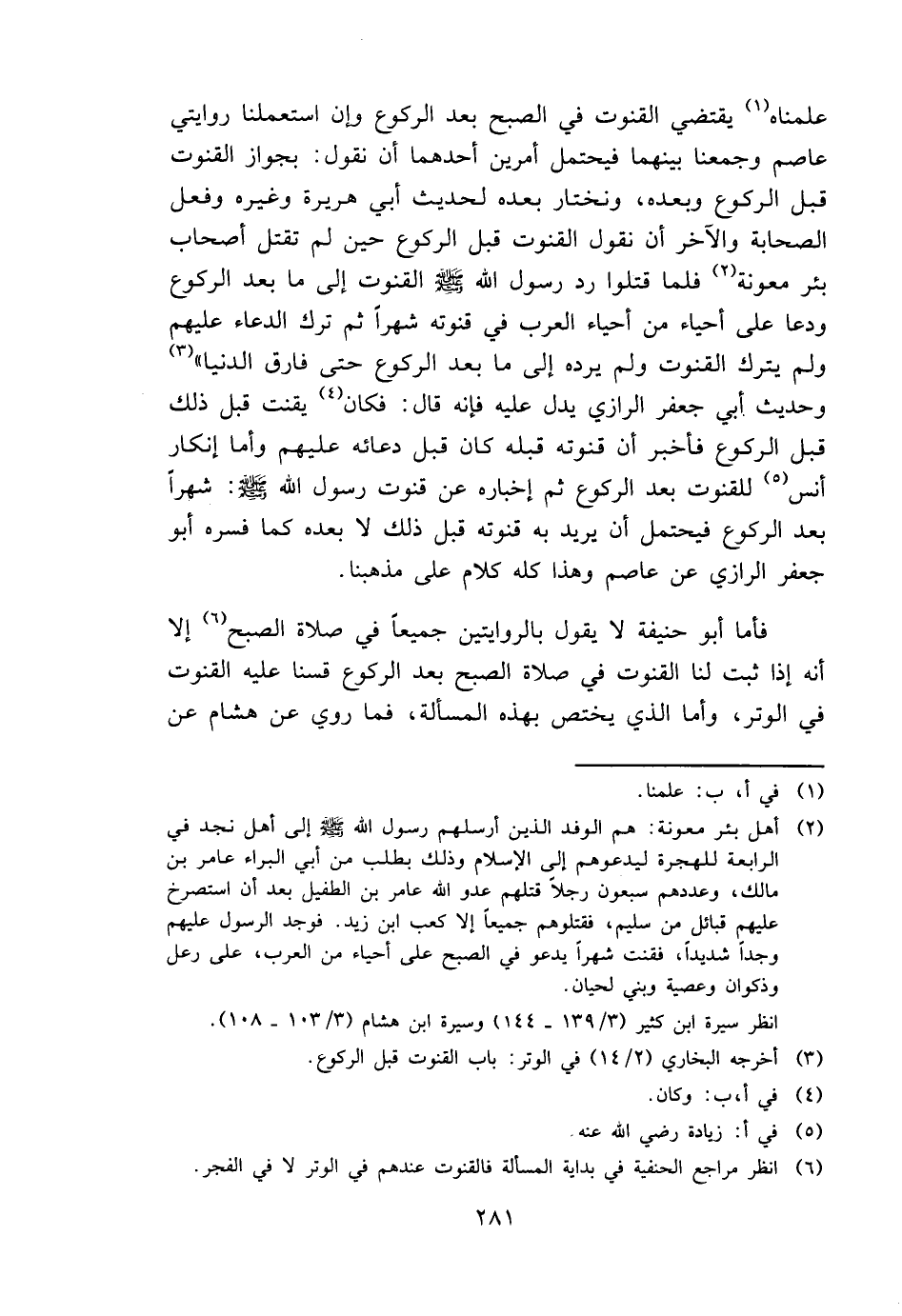 علمناه يَقْتَضِي الْقُنُوت فِي الصُّبْح بعد الرُّكُوع وَإِن استعملنا روايتي عَاصِم وجمعنا بَينهمَا فَيحْتَمل أَمريْن أَحدهمَا أَن نقُول: بِجَوَاز الْقُنُوت قبل الرُّكُوع وَبعده، ونختار بعده لحَدِيث أبي هُرَيْرَة وَغَيره وَفعل الصَّحَابَة وَالْآخر أَن نقُول الْقُنُوت قبل الرُّكُوع حِين لم تقتل أَصْحَاب بِئْر مَعُونَة فَلَمَّا قتلوا رد رَسُول الله - صَلَّى اللَّهُ عَلَيْهِ وَسَلَّم َ - الْقُنُوت إِلَى مَا بعد الرُّكُوع ودعا على أَحيَاء من أَحيَاء الْعَرَب فِي قنوته شهرا ثمَّ ترك الدُّعَاء عَلَيْهِم وَلم يتْرك الْقُنُوت وَلم يردهُ إِلَى مَا بعد الرُّكُوع حَتَّى فَارق الدُّنْيَا " وَحَدِيث أبي جَعْفَر الرَّازِيّ يدل عَلَيْهِ فَإِنَّهُ قَالَ: فَكَانَ يقنت قبل ذَلِك قبل الرُّكُوع فَأخْبر أَن قنوته قبله كَانَ قبل دُعَائِهِ عَلَيْهِم وَأما إِنْكَار أنس للقنوت بعد الرُّكُوع ثمَّ إخْبَاره عَن قنوت رَسُول الله - صَلَّى اللَّهُ عَلَيْهِ وَسَلَّم َ -: شهرا بعد الرُّكُوع فَيحْتَمل أَن يُرِيد بِهِ قنوته قبل ذَلِك لَا بعده كَمَا فسره أَبُو جَعْفَر الرَّازِيّ عَن عَاصِم وَهَذَا كُله كَلَام على مَذْهَبنَا.