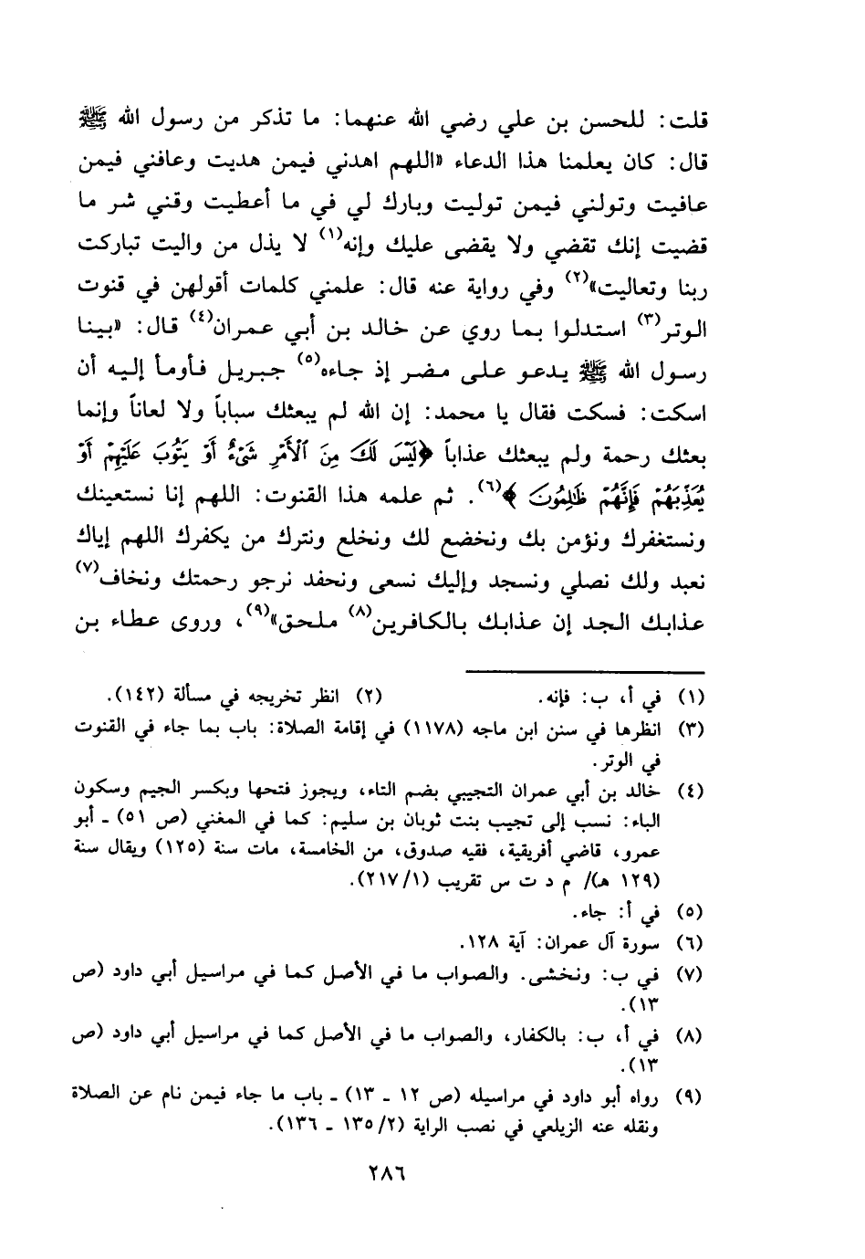 قلت: لِلْحسنِ بن عَليّ رَضِي الله عَنْهُمَا: مَا تذكر من رَسُول الله - صَلَّى اللَّهُ عَلَيْهِ وَسَلَّم َ - قَالَ: كَانَ يعلمنَا هَذَا الدُّعَاء " اللَّهُمَّ اهدني فِيمَن هديت وَعَافنِي فِيمَن عافيت وتولني فِيمَن توليت وَبَارك لي فِي مَا أَعْطَيْت وقني شَرّ مَا قضيت إِنَّك تقضي وَلَا يقْضى عَلَيْك وَإنَّهُ لَا يذل من واليت تَبَارَكت رَبنَا وَتَعَالَيْت " وَفِي رِوَايَة عَنهُ قَالَ: عَلمنِي كَلِمَات أقولهن فِي قنوت الْوتر استدلوا بِمَا رُوِيَ عَن خَالِد بن أبي عمرَان قَالَ: " بَينا رَسُول الله - صَلَّى اللَّهُ عَلَيْهِ وَسَلَّم َ - يَدْعُو على مُضر إِذْ جَاءَهُ جِبْرِيل فَأَوْمأ إِلَيْهِ أَن اسْكُتْ: فَسكت فَقَالَ يَا مُحَمَّد: إِن الله لم يَبْعَثك سبابا وَلَا لعانا وَإِنَّمَا بَعثك رَحْمَة وَلم يَبْعَثك عذَابا {لَيْسَ لَك من الْأَمر شَيْء أَو يَتُوب عَلَيْهِم أَو يعذبهم فَإِنَّهُم ظَالِمُونَ} . ثمَّ علمه هَذَا الْقُنُوت: اللَّهُمَّ إِنَّا نستعينك ونستغفرك ونؤمن بك ونخضع لَك ونخلع ونترك من يكفرك اللَّهُمَّ إياك نعْبد وَلَك نصلي ونسجد وَإِلَيْك نسعى ونحفد نرجو رحمتك ونخاف عذابك الْجد إِن عذابك بالكافرين مُلْحق "، وروى عَطاء بن