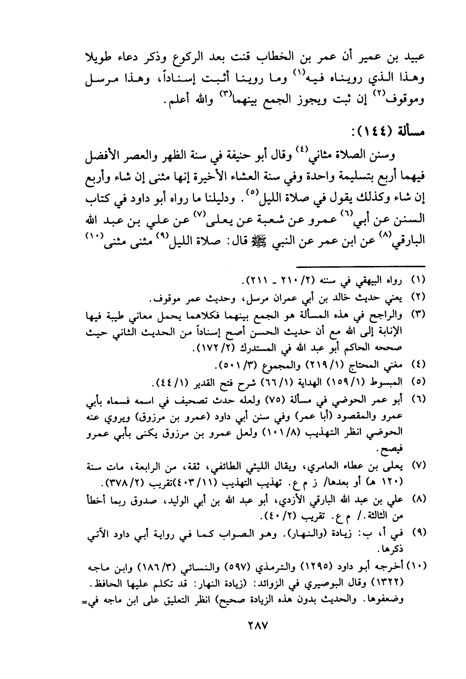 وَسنَن الصَّلَاة مثاني وَقَالَ أَبُو حنيفَة فِي سنة الظّهْر وَالْعصر الْأَفْضَل فيهمَا أَربع بِتَسْلِيمَة وَاحِدَة وَفِي سنة الْعشَاء الْأَخِيرَة إِنَّهَا مثنى إِن شَاءَ وَأَرْبع إِن شَاءَ وَكَذَلِكَ يَقُول فِي صَلَاة اللَّيْل. وَدَلِيلنَا مَا رَوَاهُ أَبُو دَاوُد فِي كتاب السّنَن عَن أبي عَمْرو عَن شُعْبَة عَن يعلى عَن عَليّ بن عبد الله الْبَارِقي عَن ابْن عمر عَن النَّبِي - صَلَّى اللَّهُ عَلَيْهِ وَسَلَّم َ - قَالَ: صَلَاة اللَّيْل مثنى مثنى