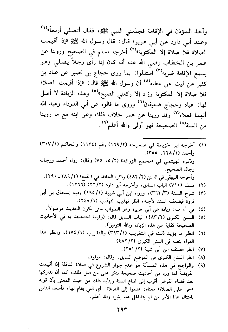 وَأخذ الْمُؤَذّن فِي الْإِقَامَة فجذبني النَّبِي - صَلَّى اللَّهُ عَلَيْهِ وَسَلَّم َ -، فَقَالَ أَتُصَلِّي أَرْبعا " وَعند أبي دَاوُد عَن أبي هُرَيْرَة قَالَ: قَالَ رَسُول الله - صَلَّى اللَّهُ عَلَيْهِ وَسَلَّم َ - " إِذا أُقِيمَت الصَّلَاة فَلَا صَلَاة إِلَّا الْمَكْتُوبَة " أخرجه مُسلم فِي الصَّحِيح وروينا عَن عمر بن الْخطاب رَضِي الله عَنهُ أَنه كَانَ إِذا رأى رجلا يُصَلِّي وَهُوَ يسمع الْإِقَامَة ضربه استدلوا: بِمَا روى حجاج بن نصير عَن عباد بن كثير عَن لَيْث عَن عَطاء أَن رَسُول الله - صَلَّى اللَّهُ عَلَيْهِ وَسَلَّم َ - قَالَ: " إِذا أُقِيمَت الصَّلَاة فَلَا صَلَاة إِلَّا الْمَكْتُوبَة وَزَاد إِلَّا رَكْعَتي الصُّبْح " وَهَذِه الزِّيَادَة لَا أصل لَهَا: عباد وحجاج ضعيفان وروى مَا قَالُوهُ عَن أبي الدَّرْدَاء وَعبد الله أَنَّهُمَا فعلاه وَقد روينَا عَن عمر خلاف ذَلِك وَعَن ابْنه مَعَ مَا روينَا من السّنة الصَّحِيحَة فَهُوَ أولى وَالله أعلم.