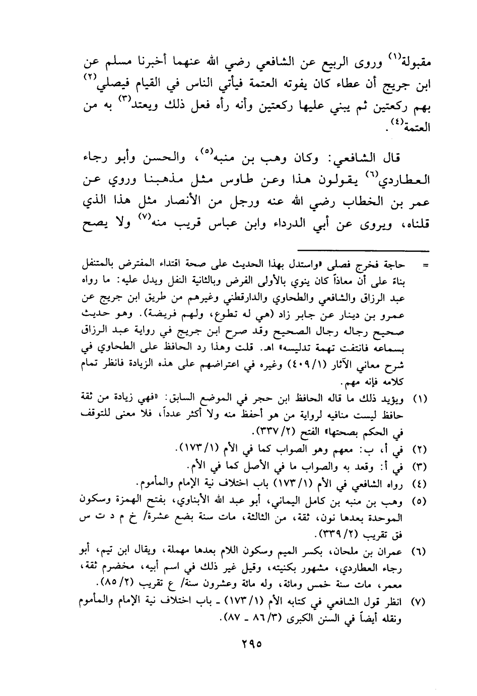 قَالَ الشَّافِعِي: وَكَانَ وهب بن مُنَبّه، وَالْحسن وَأَبُو رَجَاء العطاردي يَقُولُونَ هَذَا وَعَن طَاوس مثل مَذْهَبنَا وَرُوِيَ عَن عمر بن الْخطاب رَضِي الله عَنهُ وَرجل من الْأَنْصَار مثل هَذَا الَّذِي قُلْنَاهُ، ويروى عَن أبي الدَّرْدَاء وَابْن عَبَّاس قريب مِنْهُ وَلَا يَصح