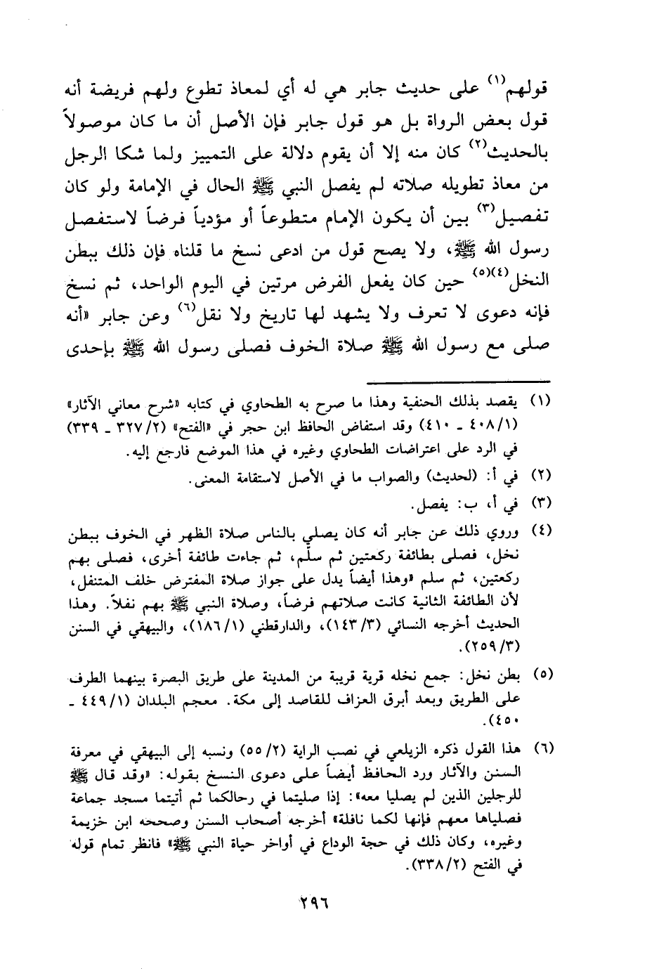 قَوْلهم على حَدِيث جَابر هِيَ لَهُ أَي لِمعَاذ تطوع وَلَهُم فَرِيضَة أَنه قَول بعض الروَاة بل هُوَ قَول جَابر فَإِن الأَصْل أَن مَا كَانَ مَوْصُولا بِالْحَدِيثِ كَانَ مِنْهُ إِلَّا أَن يقوم دلَالَة على التَّمْيِيز وَلما شكا الرجل من معَاذ تطويله صلَاته لم يفصل النَّبِي - صَلَّى اللَّهُ عَلَيْهِ وَسَلَّم َ - الْحَال فِي الْإِمَامَة وَلَو كَانَ تَفْصِيل بَين أَن يكون الإِمَام مُتَطَوعا أَو مُؤديا فرضا لاستفصل رَسُول الله - صَلَّى اللَّهُ عَلَيْهِ وَسَلَّم َ -، وَلَا يَصح قَول من ادّعى نسخ مَا قُلْنَاهُ فَإِن ذَلِك بِبَطن النّخل حِين كَانَ يفعل الْفَرْض مرَّتَيْنِ فِي الْيَوْم الْوَاحِد، ثمَّ نسخ فَإِنَّهُ دَعْوَى لَا تعرف وَلَا يشْهد لَهَا تَارِيخ وَلَا نقل وَعَن جَابر " أَنه صلى مَعَ رَسُول الله - صَلَّى اللَّهُ عَلَيْهِ وَسَلَّم َ - صَلَاة الْخَوْف فصلى رَسُول الله - صَلَّى اللَّهُ عَلَيْهِ وَسَلَّم َ - بِإِحْدَى