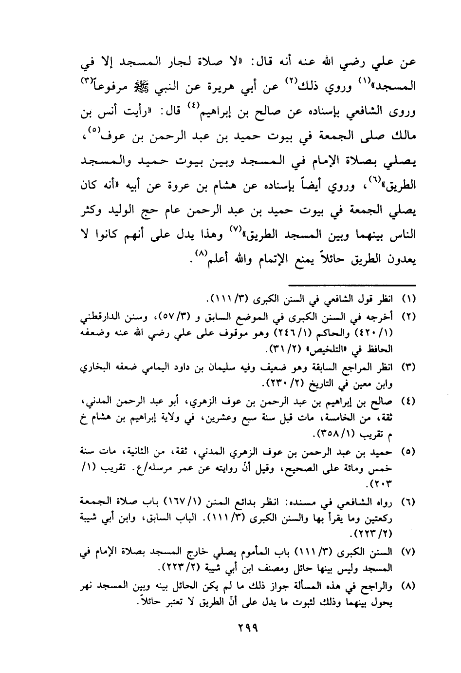 عَن عَليّ رَضِي الله عَنهُ أَنه قَالَ: " لَا صَلَاة لِجَار الْمَسْجِد إِلَّا فِي الْمَسْجِد " وَرُوِيَ ذَلِك عَن أبي هُرَيْرَة عَن النَّبِي - صَلَّى اللَّهُ عَلَيْهِ وَسَلَّم َ - مَرْفُوعا وروى الشَّافِعِي بِإِسْنَادِهِ عَن صَالح بن إِبْرَاهِيم قَالَ: " رَأَيْت أنس بن مَالك صلى الْجُمُعَة فِي بيُوت حميد بن عبد الرَّحْمَن بن عَوْف، يُصَلِّي بِصَلَاة الإِمَام فِي الْمَسْجِد وَبَين بيُوت حميد وَالْمَسْجِد الطَّرِيق "، وَرُوِيَ أَيْضا بِإِسْنَادِهِ عَن هِشَام بن عُرْوَة عَن أَبِيه " أَنه كَانَ يُصَلِّي الْجُمُعَة فِي بيُوت حميد بن عبد الرَّحْمَن عَام حج الْوَلِيد وَكثر النَّاس بَينهمَا وَبَين الْمَسْجِد الطَّرِيق " وَهَذَا يدل على أَنهم كَانُوا لَا يعدون الطَّرِيق حَائِلا يمْنَع الْإِتْمَام وَالله أعلم.