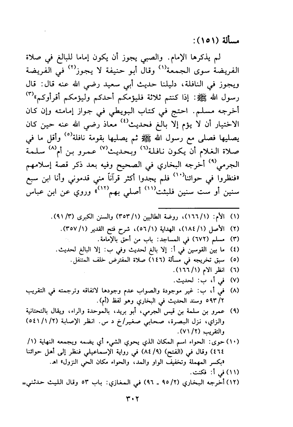 لم يذكرهَا الإِمَام. وَالصَّبِيّ يجوز أَن يكون إِمَامًا للبالغ فِي صَلَاة الْفَرِيضَة سوى الْجُمُعَة وَقَالَ أَبُو حنيفَة لَا يجوز فِي الْفَرِيضَة وَيجوز فِي النَّافِلَة، دليلنا حَدِيث أبي سعيد الْخُدْرِيّ رَضِي الله عَنهُ قَالَ: قَالَ رَسُول الله - صَلَّى اللَّهُ عَلَيْهِ وَسَلَّم َ -: إِذا كُنْتُم ثَلَاثَة فليؤمكم أحدكُم وليؤمكم أقرأوكم " أخرجه مُسلم. احْتج فِي كتاب الْبُوَيْطِيّ فِي جَوَاز إِمَامَته وَإِن كَانَ الِاخْتِيَار أَن لَا يؤم إِلَّا بَالغ فَحَدِيث معَاذ رَضِي الله عَنهُ حِين كَانَ يُصليهَا فصلى مَعَ رَسُول الله - صَلَّى اللَّهُ عَلَيْهِ وَسَلَّم َ - ثمَّ يُصليهَا بقَوْمه نَافِلَة وَأَقل مَا فِي صَلَاة الْغُلَام أَن يكون نَافِلَة وَبِحَدِيث عَمْرو بن أم سَلمَة الْجرْمِي أخرجه البُخَارِيّ فِي الصَّحِيح وَفِيه بعد ذكر قصَّة إسْلَامهمْ " فنظروا فِي حوائنا فَلم يَجدوا أَكثر قُرْآنًا مني قدموني وَأَنا ابْن سبع سِنِين أَو سِتّ سِنِين فَلَبثت أُصَلِّي بهم " وَرُوِيَ عَن ابْن عَبَّاس