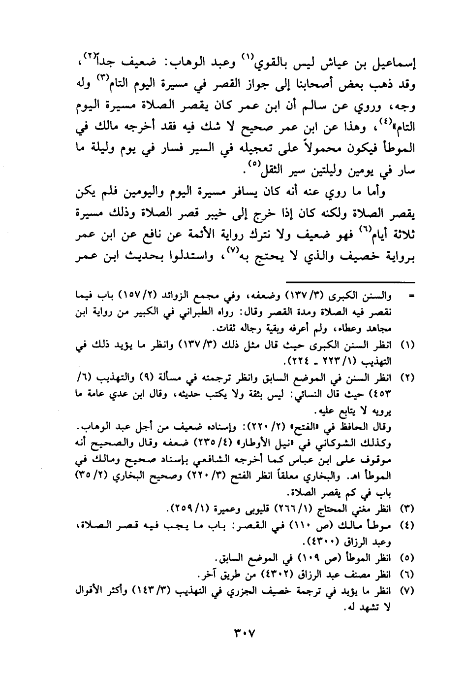 إِسْمَاعِيل بن عَيَّاش لَيْسَ بِالْقَوِيّ وَعبد الْوَهَّاب: ضَعِيف جدا، وَقد ذهب بعض أَصْحَابنَا إِلَى جَوَاز الْقصر فِي مسيرَة الْيَوْم التَّام وَله وَجه، وَرُوِيَ عَن سَالم أَن ابْن عمر كَانَ يقصر الصَّلَاة مسيرَة الْيَوْم التَّام "، وَهَذَا عَن ابْن عمر صَحِيح لَا شكّ فِيهِ فقد أخرجه مَالك فِي الْمُوَطَّأ فَيكون مَحْمُولا على تَعْجِيله فِي السّير فَسَار فِي يَوْم وَلَيْلَة مَا سَار فِي يَوْمَيْنِ وليلتين سير الثّقل.