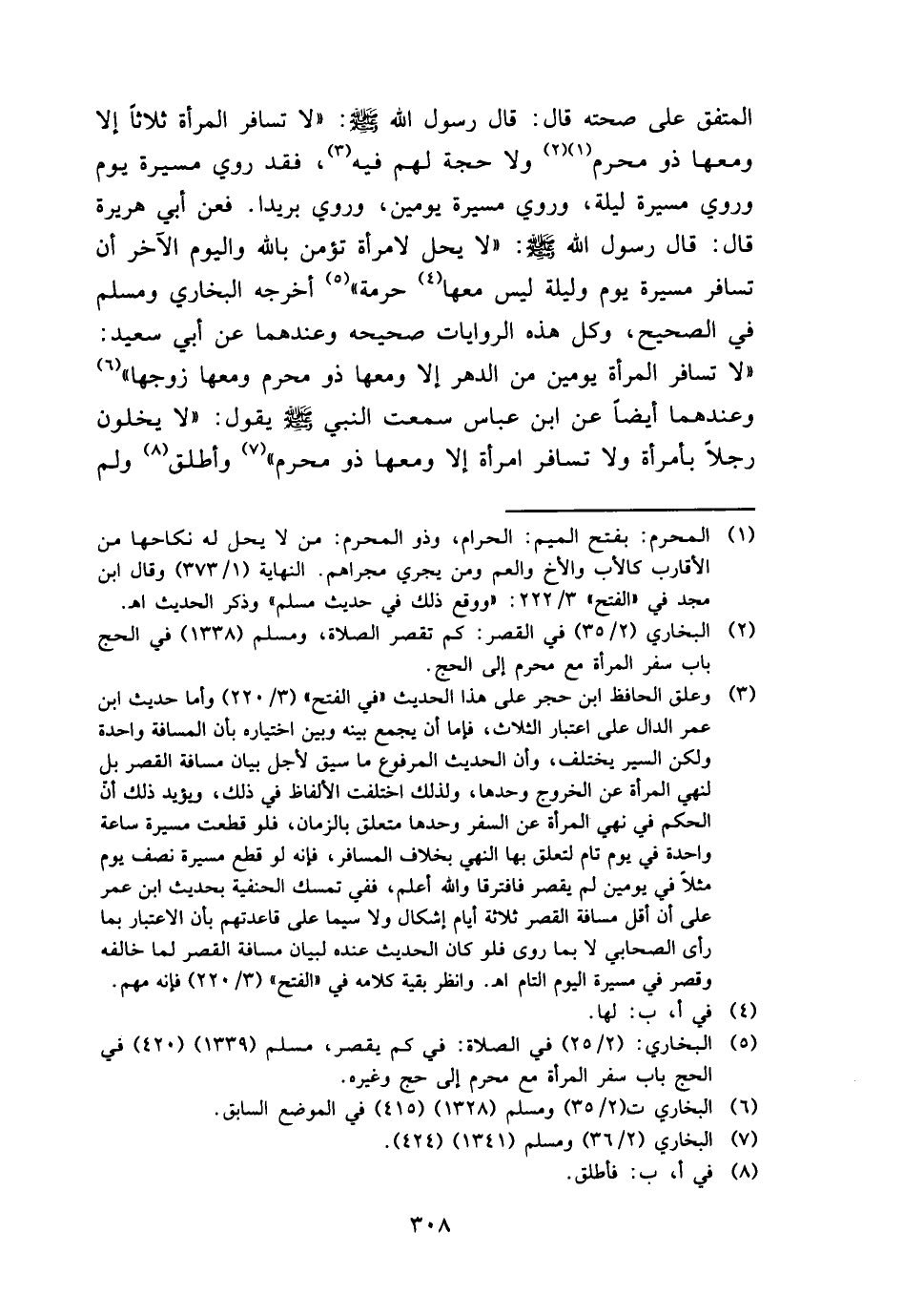 الْمُتَّفق على صِحَّته قَالَ: قَالَ رَسُول الله - صَلَّى اللَّهُ عَلَيْهِ وَسَلَّم َ -: " لَا تُسَافِر الْمَرْأَة ثَلَاثًا إِلَّا وَمَعَهَا ذُو محرم وَلَا حجَّة لَهُم فِيهِ، فقد رُوِيَ مسيرَة يَوْم وَرُوِيَ مسيرَة لَيْلَة، وَرُوِيَ مسيرَة يَوْمَيْنِ، وَرُوِيَ بريدا. فَعَن أبي هُرَيْرَة قَالَ: قَالَ رَسُول الله - صَلَّى اللَّهُ عَلَيْهِ وَسَلَّم َ -: " لَا يحل لامْرَأَة تؤمن بِاللَّه وَالْيَوْم الآخر أَن تُسَافِر مسيرَة يَوْم وَلَيْلَة وَلَيْسَ مَعهَا حُرْمَة " أخرجه البُخَارِيّ وَمُسلم فِي الصَّحِيح، وكل هَذِه الرِّوَايَات صَحِيحَة وَعِنْدَهُمَا عَن أبي سعيد: " لَا تُسَافِر الْمَرْأَة يَوْمَيْنِ من الدَّهْر إِلَّا وَمَعَهَا ذُو محرم وَمَعَهَا زَوجهَا " وَعِنْدَهُمَا أَيْضا عَن ابْن عَبَّاس سَمِعت النَّبِي - صَلَّى اللَّهُ عَلَيْهِ وَسَلَّم َ - يَقُول: " لَا يخلون رجلا بِامْرَأَة وَلَا تُسَافِر امْرَأَة إِلَّا وَمَعَهَا ذُو محرم " وَأطلق وَلم