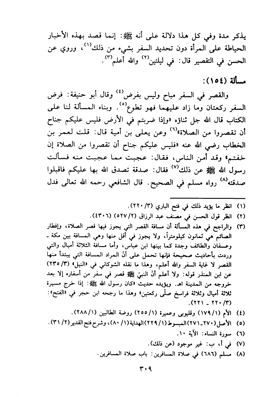 وَالْقصر فِي السّفر مُبَاح وَلَيْسَ بِفَرْض وَقَالَ أَبُو حنيفَة: فرض السّفر رَكْعَتَانِ وَمَا زَاد عَلَيْهِمَا فَهُوَ تطوع. وَبِنَاء الْمَسْأَلَة لنا على الْكتاب قَالَ الله جلّ ثَنَاؤُهُ " وَإِذا ضَرَبْتُمْ فِي الأَرْض فَلَيْسَ عَلَيْكُم جنَاح أَن تقصرُوا من الصَّلَاة " وَعَن يعلى بن أُميَّة قَالَ: قلت لعمر بن الْخطاب رَضِي الله عَنهُ " فَلَيْسَ عَلَيْكُم جنَاح أَن تقصرُوا من الصَّلَاة إِن خِفْتُمْ وَقد أَمن النَّاس "، فَقَالَ: عجبت مِمَّا عجبت مِنْهُ فَسَأَلت رَسُول الله - صَلَّى اللَّهُ عَلَيْهِ وَسَلَّم َ - عَن ذَلِك فَقَالَ: صَدَقَة تصدق الله بهَا عَلَيْكُم فاقبلوا صدقته رَوَاهُ مُسلم فِي الصَّحِيح. قَالَ الشَّافِعِي رَحمَه الله تَعَالَى فَدلَّ