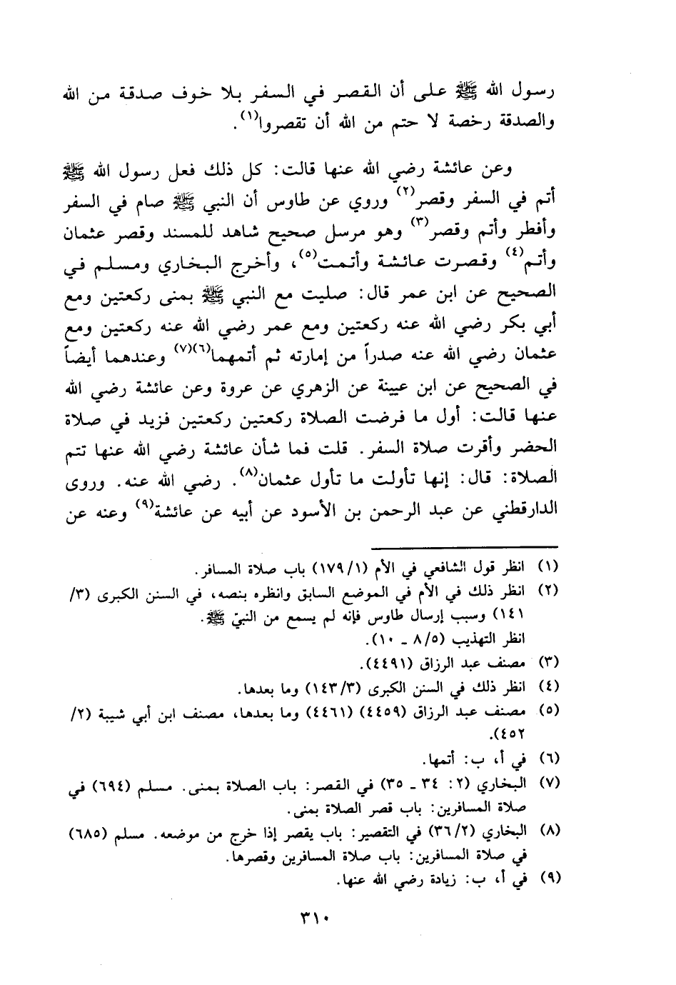 وَعَن عَائِشَة رَضِي الله عَنْهَا قَالَت: كل ذَلِك فعل رَسُول الله - صَلَّى اللَّهُ عَلَيْهِ وَسَلَّم َ - أتم فِي السّفر وَقصر وَرُوِيَ عَن طَاوس أَن النَّبِي - صَلَّى اللَّهُ عَلَيْهِ وَسَلَّم َ - صَامَ فِي السّفر وَأفْطر وَأتم وَقصر وَهُوَ مُرْسل صَحِيح شَاهد للمسند وَقصر عُثْمَان وَأتم وَقصرت عَائِشَة وأتمت، وَأخرج البُخَارِيّ وَمُسلم فِي الصَّحِيح عَن ابْن عمر قَالَ: صليت مَعَ النَّبِي - صَلَّى اللَّهُ عَلَيْهِ وَسَلَّم َ - بمنى رَكْعَتَيْنِ وَمَعَ أبي بكر رَضِي الله عَنهُ رَكْعَتَيْنِ وَمَعَ عمر رَضِي الله عَنهُ رَكْعَتَيْنِ وَمَعَ عُثْمَان رَضِي الله عَنهُ صَدرا من إمارته ثمَّ أتمهما وَعِنْدَهُمَا أَيْضا فِي الصَّحِيح عَن ابْن عُيَيْنَة عَن الزُّهْرِيّ عَن عُرْوَة وَعَن عَائِشَة رَضِي الله عَنْهَا قَالَت: أول مَا فرضت الصَّلَاة رَكْعَتَيْنِ رَكْعَتَيْنِ فزيد فِي صَلَاة الْحَضَر وأقرت صَلَاة السّفر. قلت فَمَا شَأْن عَائِشَة رَضِي الله عَنْهَا تتمّ الصَّلَاة: قَالَ: إِنَّهَا تأولت مَا تَأَول عُثْمَان رَضِي الله عَنهُ. وروى الدراقطني عَن عبد الرَّحْمَن بن الْأسود عَن أَبِيه عَن عَائِشَة وَعنهُ عَن