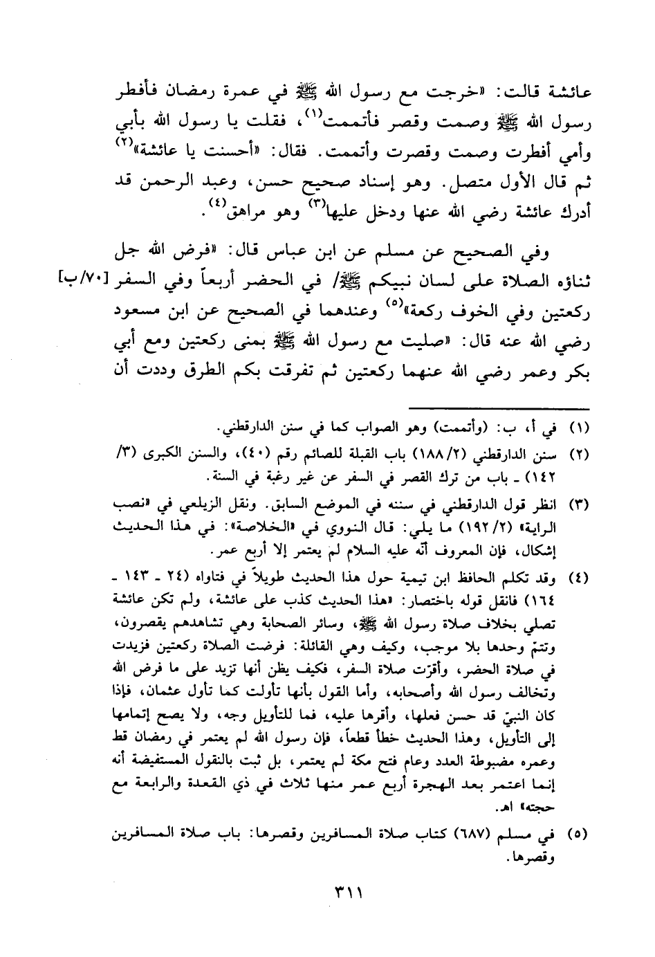 وَفِي الصَّحِيح عَن مُسلم عَن ابْن عَبَّاس قَالَ: " فرض الله جلّ ثَنَاؤُهُ الصَّلَاة على لِسَان نَبِيكُم - صَلَّى اللَّهُ عَلَيْهِ وَسَلَّم َ - / فِي الْحَضَر أَرْبعا وَفِي السّفر رَكْعَتَيْنِ وَفِي الْخَوْف رَكْعَة " وَعِنْدَهُمَا فِي الصَّحِيح عَن ابْن مَسْعُود رَضِي الله عَنهُ قَالَ: " صليت مَعَ رَسُول الله - صَلَّى اللَّهُ عَلَيْهِ وَسَلَّم َ - بمنى رَكْعَتَيْنِ وَمَعَ أبي بكر وَعمر رَضِي الله عَنْهُمَا رَكْعَتَيْنِ ثمَّ تَفَرَّقت بكم الطّرق وددت أَن