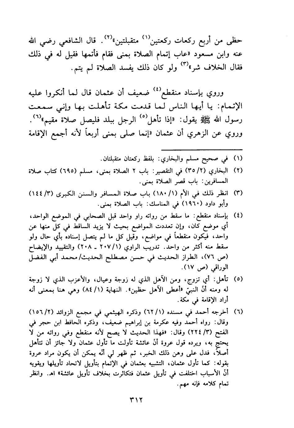 وَرُوِيَ بِإِسْنَاد مُنْقَطع ضَعِيف أَن عُثْمَان قَالَ لما أَنْكَرُوا عَلَيْهِ الْإِتْمَام: يَا أَيهَا النَّاس لما قدمت مَكَّة تأهلت بهَا وَإِنِّي سَمِعت رَسُول الله - صَلَّى اللَّهُ عَلَيْهِ وَسَلَّم َ - يَقُول: " إِذا تأهل الرجل بِبَلَد فَليصل صَلَاة مُقيم ". وَرُوِيَ عَن الزُّهْرِيّ أَن عُثْمَان " إِنَّمَا صلى بمنى أَرْبعا لِأَنَّهُ أجمع الْإِقَامَة