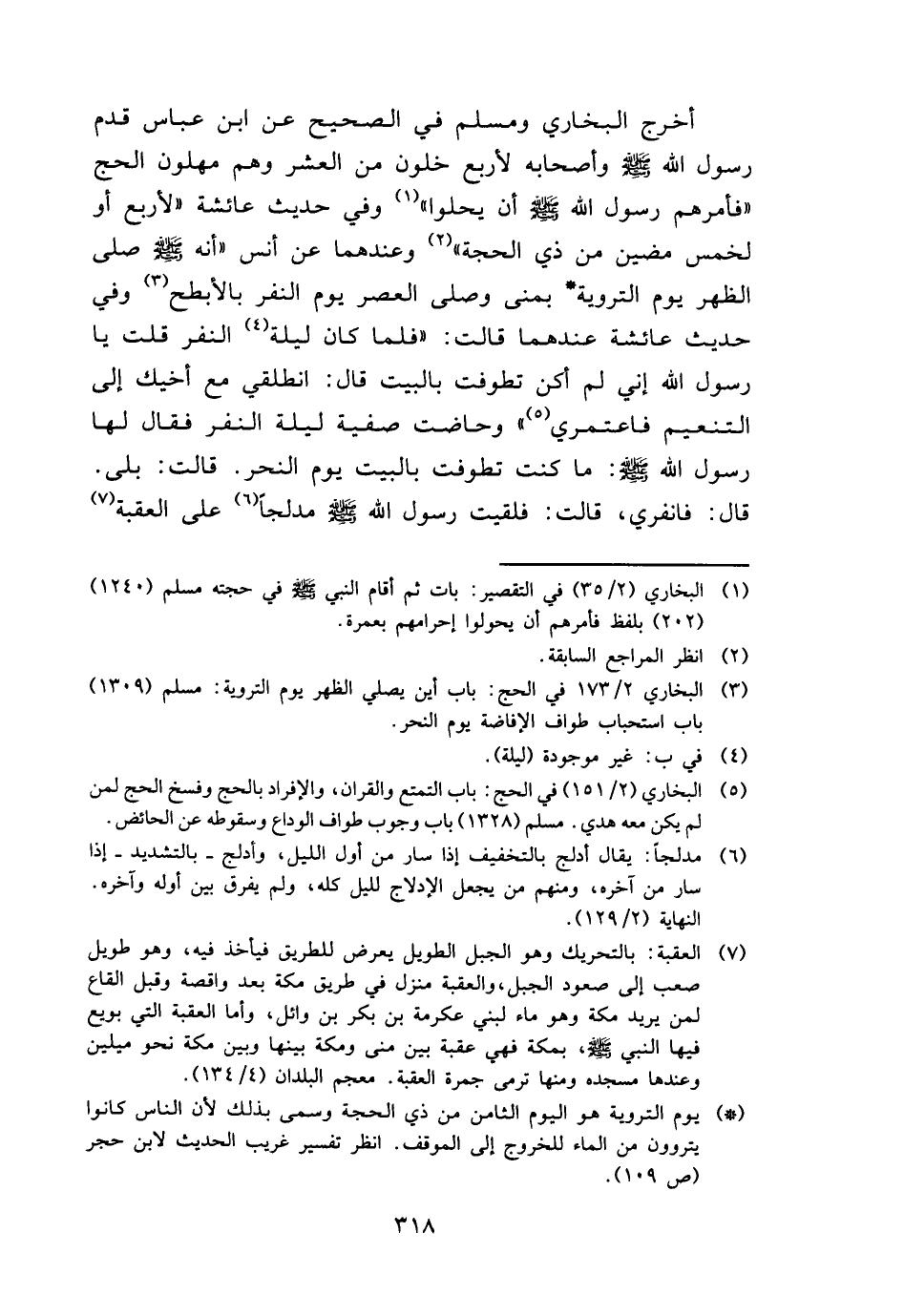 أخرج البُخَارِيّ وَمُسلم فِي الصَّحِيح عَن ابْن عَبَّاس قدم رَسُول الله - صَلَّى اللَّهُ عَلَيْهِ وَسَلَّم َ - وَأَصْحَابه لأَرْبَع خلون من الْعشْر وهم مهلون الْحَج " فَأَمرهمْ رَسُول الله - صَلَّى اللَّهُ عَلَيْهِ وَسَلَّم َ - أَن يحلوا " وَفِي حَدِيث عَائِشَة " لأَرْبَع أَو لخمس مضين من ذِي الْحجَّة " وَعِنْدَهُمَا عَن أنس " أَنه - صَلَّى اللَّهُ عَلَيْهِ وَسَلَّم َ - صلى الظّهْر يَوْم التَّرويَة بمنى وَصلى الْعَصْر يَوْم النَّفر بِالْأَبْطح وَفِي حَدِيث عَائِشَة عِنْدهمَا قَالَت: " فَلَمَّا كَانَ لَيْلَة النَّفر قلت يَا رَسُول الله إِنِّي لم أكن تطوفت بِالْبَيْتِ قَالَ: انطلقي مَعَ أَخِيك إِلَى التَّنْعِيم فاعتمري " وحاضت صَفِيَّة لَيْلَة النَّفر فَقَالَ لَهَا رَسُول الله - صَلَّى اللَّهُ عَلَيْهِ وَسَلَّم َ -: مَا كنت تطوفت بِالْبَيْتِ يَوْم النَّحْر. قَالَت: بلَى. قَالَ: فانفري، قَالَت: فَلَقِيت رَسُول الله - صَلَّى اللَّهُ عَلَيْهِ وَسَلَّم َ - مدلجا على الْعقبَة