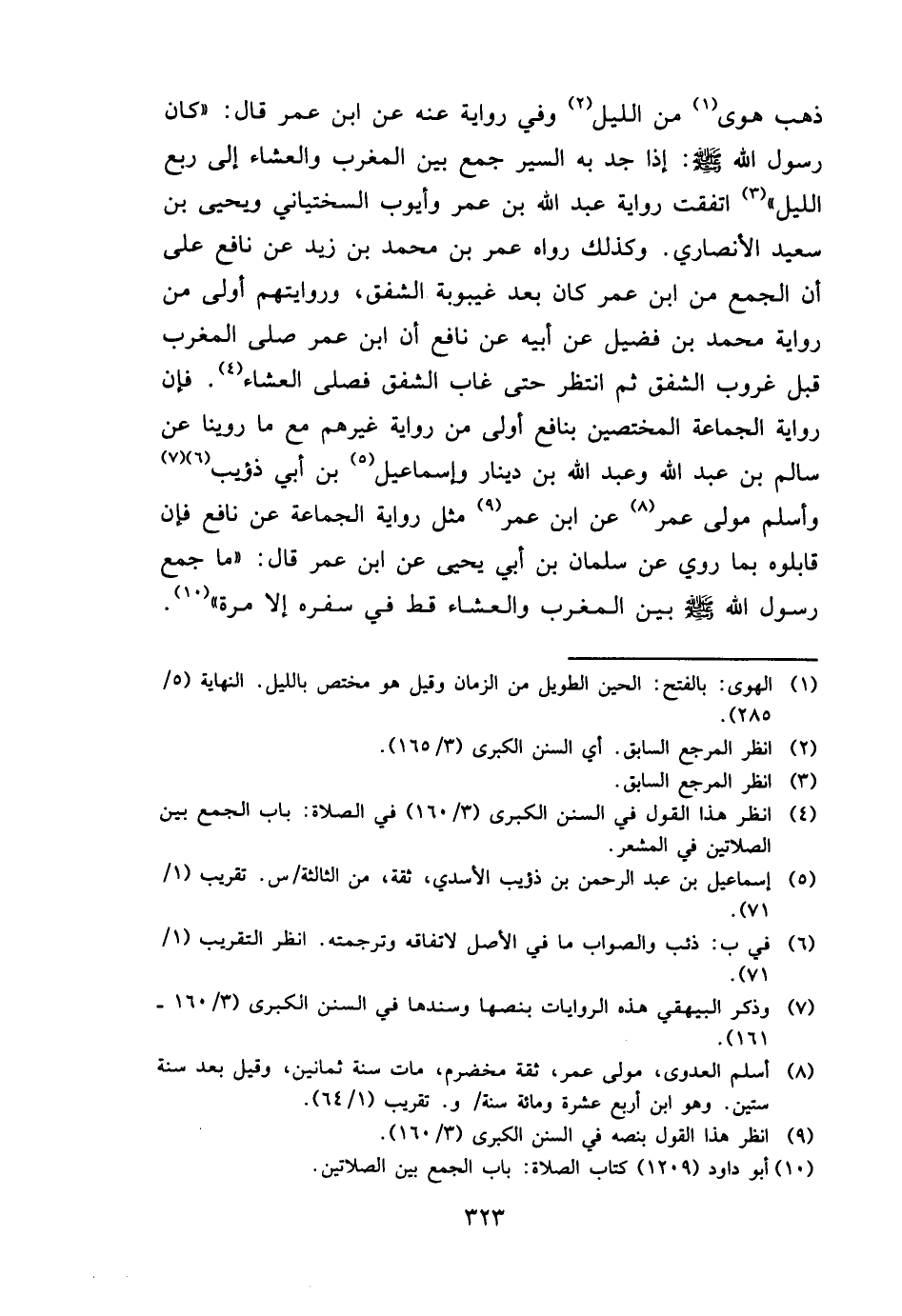 ذهب هوى من اللَّيْل وَفِي رِوَايَة عَنهُ عَن ابْن عمر قَالَ: " كَانَ رَسُول الله - صَلَّى اللَّهُ عَلَيْهِ وَسَلَّم َ -: إِذا جد بِهِ السّير جمع بَين الْمغرب وَالْعشَاء إِلَى ربع اللَّيْل " اتّفقت رِوَايَة عبد الله بن عمر وَأَيوب السّخْتِيَانِيّ وَيحيى بن سعيد الْأنْصَارِيّ. وَكَذَلِكَ رَوَاهُ عمر بن مُحَمَّد بن زيد عَن نَافِع على أَن الْجمع من ابْن عمر كَانَ بعد غيبوبة الشَّفق، وروايتهم أولى من رِوَايَة مُحَمَّد بن فُضَيْل عَن أَبِيه عَن نَافِع أَن ابْن عمر صلى الْمغرب قبل غرُوب الشَّفق ثمَّ انْتظر حَتَّى غَابَ الشَّفق فصلى الْعشَاء. فَإِن رِوَايَة الْجَمَاعَة المختصين بِنَافِع أولى من رِوَايَة غَيرهم مَعَ مَا روينَا عَن سَالم بن عبد الله وَعبد الله بن دِينَار وَإِسْمَاعِيل بن أبي ذُؤَيْب وَأسلم مولى عمر عَن ابْن عمر مثل رِوَايَة الْجَمَاعَة عَن نَافِع فَإِن قابلوه بِمَا رُوِيَ عَن سلمَان بن أبي يحيى عَن ابْن عمر قَالَ: " مَا جمع رَسُول الله - صَلَّى اللَّهُ عَلَيْهِ وَسَلَّم َ - بَين الْمغرب وَالْعشَاء قطّ فِي سَفَره إِلَّا مرّة ".
