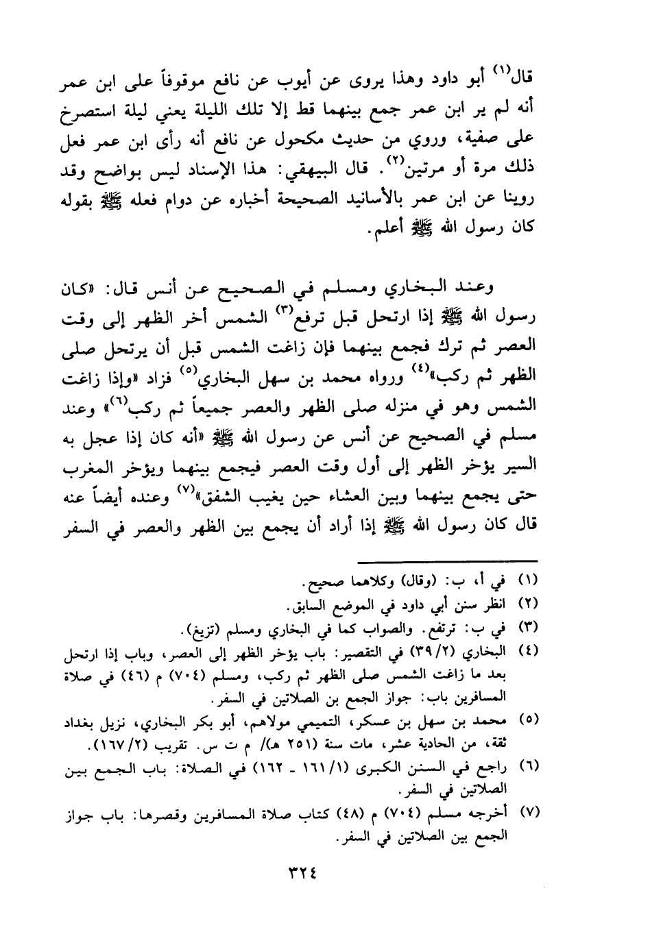 قَالَ أَبُو دَاوُد وَهَذَا يرْوى عَن أَيُّوب عَن نَافِع مَوْقُوفا على ابْن عمر أَنه لم ير ابْن عمر جمع بَينهمَا قطّ إِلَّا تِلْكَ اللَّيْلَة يَعْنِي لَيْلَة استصرخ على صَفِيَّة، وَرُوِيَ من حَدِيث مَكْحُول عَن نَافِع أَنه رأى ابْن عمر فعل ذَلِك مرّة أَو مرَّتَيْنِ. قَالَ الْبَيْهَقِيّ: هَذَا الْإِسْنَاد لَيْسَ بواضح وَقد روينَا عَن ابْن عمر بِالْأَسَانِيدِ الصَّحِيحَة أخباره عَن دوَام فعله - صَلَّى اللَّهُ عَلَيْهِ وَسَلَّم َ - بقوله كَانَ رَسُول الله - صَلَّى اللَّهُ عَلَيْهِ وَسَلَّم َ - أعلم.