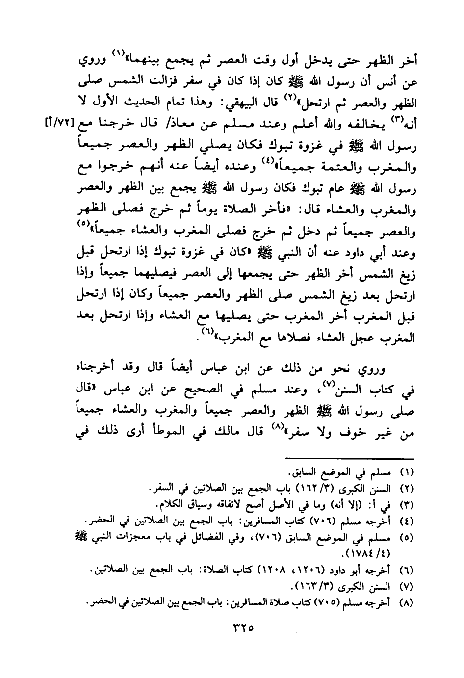 أخر الظّهْر حَتَّى يدْخل أول وَقت الْعَصْر ثمَّ يجمع بَينهمَا " وَرُوِيَ عَن أنس أَن رَسُول الله - صَلَّى اللَّهُ عَلَيْهِ وَسَلَّم َ - كَانَ إِذا كَانَ فِي سفر فَزَالَتْ الشَّمْس صلى الظّهْر وَالْعصر ثمَّ ارتحل " قَالَ الْبَيْهَقِيّ: وَهَذَا تَمام الحَدِيث الأول لَا أَنه يُخَالِفهُ وَالله أعلم وَعند مُسلم عَن معَاذ / قَالَ خرجنَا مَعَ رَسُول الله - صَلَّى اللَّهُ عَلَيْهِ وَسَلَّم َ - فِي غَزْوَة تَبُوك فَكَانَ يُصَلِّي الظّهْر وَالْعصر جَمِيعًا وَالْمغْرب وَالْعَتَمَة جَمِيعًا " وَعِنْده أَيْضا عَنهُ أَنهم خَرجُوا مَعَ رَسُول الله - صَلَّى اللَّهُ عَلَيْهِ وَسَلَّم َ - عَام تَبُوك فَكَانَ رَسُول الله - صَلَّى اللَّهُ عَلَيْهِ وَسَلَّم َ - يجمع بَين الظّهْر وَالْعصر وَالْمغْرب وَالْعشَاء قَالَ: " فَأخر الصَّلَاة يَوْمًا ثمَّ خرج فصلى الظّهْر وَالْعصر جَمِيعًا ثمَّ دخل ثمَّ خرج فصلى الْمغرب وَالْعشَاء جَمِيعًا " وَعند أبي دَاوُد عَنهُ أَن النَّبِي - صَلَّى اللَّهُ عَلَيْهِ وَسَلَّم َ - " كَانَ فِي غَزْوَة تَبُوك إِذا ارتحل قبل زيغ الشَّمْس أخر الظّهْر حَتَّى يجمعها إِلَى الْعَصْر فيصليهما جَمِيعًا وَإِذا ارتحل بعد زيغ الشَّمْس صلى الظّهْر وَالْعصر جَمِيعًا وَكَانَ إِذا ارتحل قبل الْمغرب أخر الْمغرب حَتَّى يُصليهَا مَعَ الْعشَاء وَإِذا ارتحل بعد الْمغرب عجل الْعشَاء فَصلاهَا مَعَ الْمغرب ".