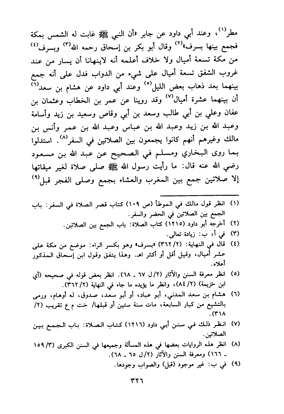مطر، وَعند أبي دَاوُد عَن جَابر " أَن النَّبِي - صَلَّى اللَّهُ عَلَيْهِ وَسَلَّم َ - غَابَتْ لَهُ الشَّمْس بِمَكَّة فَجمع بَينهَا بسرف " وَقَالَ أَبُو بكر بن إِسْحَاق رَحمَه الله وبسرف من مَكَّة تِسْعَة أَمْيَال وَلَا خلاف أعلمهُ أَنه لَا ينهانا أَن يسَار من عِنْد غرُوب الشَّفق تِسْعَة أَمْيَال على شَيْء من الدَّوَابّ فَدلَّ على أَنه جمع بَينهمَا بعد ذهَاب بعض اللَّيْل وَعند أبي دَاوُد عَن هِشَام بن سعد أَن بَينهمَا عشرَة أَمْيَال وَقد روينَا عَن عمر بن الْخطاب وَعُثْمَان بن عَفَّان وَعلي بن أبي طَالب وَسعد بن أبي وَقاص وَسَعِيد بن زيد وَأُسَامَة وَعبد الله بن زيد وَعبد الله بن عَبَّاس وَعبد الله بن عمر وَأنس بن مَالك وَغَيرهم أَنهم كَانُوا يجمعُونَ بَين الصَّلَاتَيْنِ فِي السّفر. استدلوا بِمَا روى البُخَارِيّ وَمُسلم فِي الصَّحِيح عَن عبد الله بن مَسْعُود رَضِي الله عَنهُ قَالَ: مَا رَأَيْت رَسُول الله - صَلَّى اللَّهُ عَلَيْهِ وَسَلَّم َ - صلى صَلَاة لغير ميقاتها إِلَّا صَلَاتَيْنِ جمع بَين الْمغرب وَالْعشَاء بِجمع وَصلى الْفجْر قبل