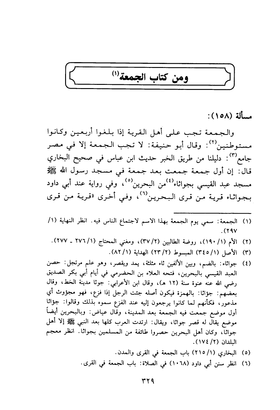وَالْجُمُعَة تجب على أهل الْقرْيَة إِذا بلغُوا أَرْبَعِينَ وَكَانُوا مستوطنين: وَقَالَ أَبُو حنيفَة: لَا تجب الْجُمُعَة إِلَّا فِي مصر جَامع: دليلنا من طَرِيق الْخَبَر حَدِيث ابْن عَبَّاس فِي صَحِيح البُخَارِيّ قَالَ: إِن أول جُمُعَة جمعت بعد جُمُعَة فِي مَسْجِد رَسُول الله - صَلَّى اللَّهُ عَلَيْهِ وَسَلَّم َ - مَسْجِد عبد الْقَيْسِي بجواثاء من الْبَحْرين، وَفِي رِوَايَة عِنْد أبي دَاوُد بجواثاء قَرْيَة من قرى الْبَحْرين، وَفِي أُخْرَى " قَرْيَة من قرى