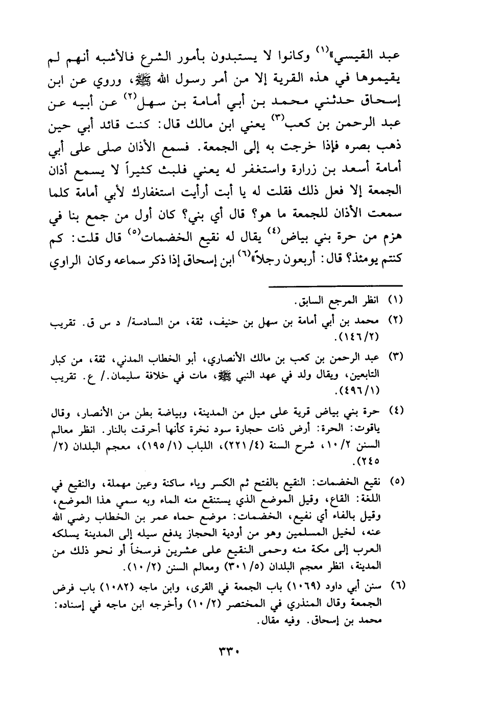عبد الْقَيْسِي " وَكَانُوا لَا يستبدون بِأُمُور الشَّرْع فالأشبه أَنهم لم يقيموها فِي هَذِه الْقرْيَة إِلَّا من أَمر رَسُول الله - صَلَّى اللَّهُ عَلَيْهِ وَسَلَّم َ -، وَرُوِيَ عَن ابْن إِسْحَاق حَدثنِي مُحَمَّد بن أبي أُمَامَة بن سهل عَن أَبِيه عَن عبد الرَّحْمَن بن كَعْب يَعْنِي ابْن مَالك قَالَ: كنت قَائِد أبي حِين ذهب بَصَره فَإِذا خرجت بِهِ إِلَى الْجُمُعَة. فَسمع الْأَذَان صلى على أبي أُمَامَة أسعد بن زُرَارَة واستغفر لَهُ يَعْنِي فَلبث كثيرا لَا يسمع أَذَان الْجُمُعَة إِلَّا فعل ذَلِك فَقلت لَهُ يَا أَبَت أَرَأَيْت استغفارك لأبي أُمَامَة كلما سَمِعت الْأَذَان للْجُمُعَة مَا هُوَ؟ قَالَ أَي بني؟ كَانَ أول من جمع بِنَا فِي هزم من حرَّة بني بَيَاض يُقَال لَهُ نَقِيع الْخضمات قَالَ قلت: كم كُنْتُم يَوْمئِذٍ؟ قَالَ: أَرْبَعُونَ رجلا " ابْن إِسْحَاق إِذا ذكر سَمَاعه وَكَانَ الرَّاوِي