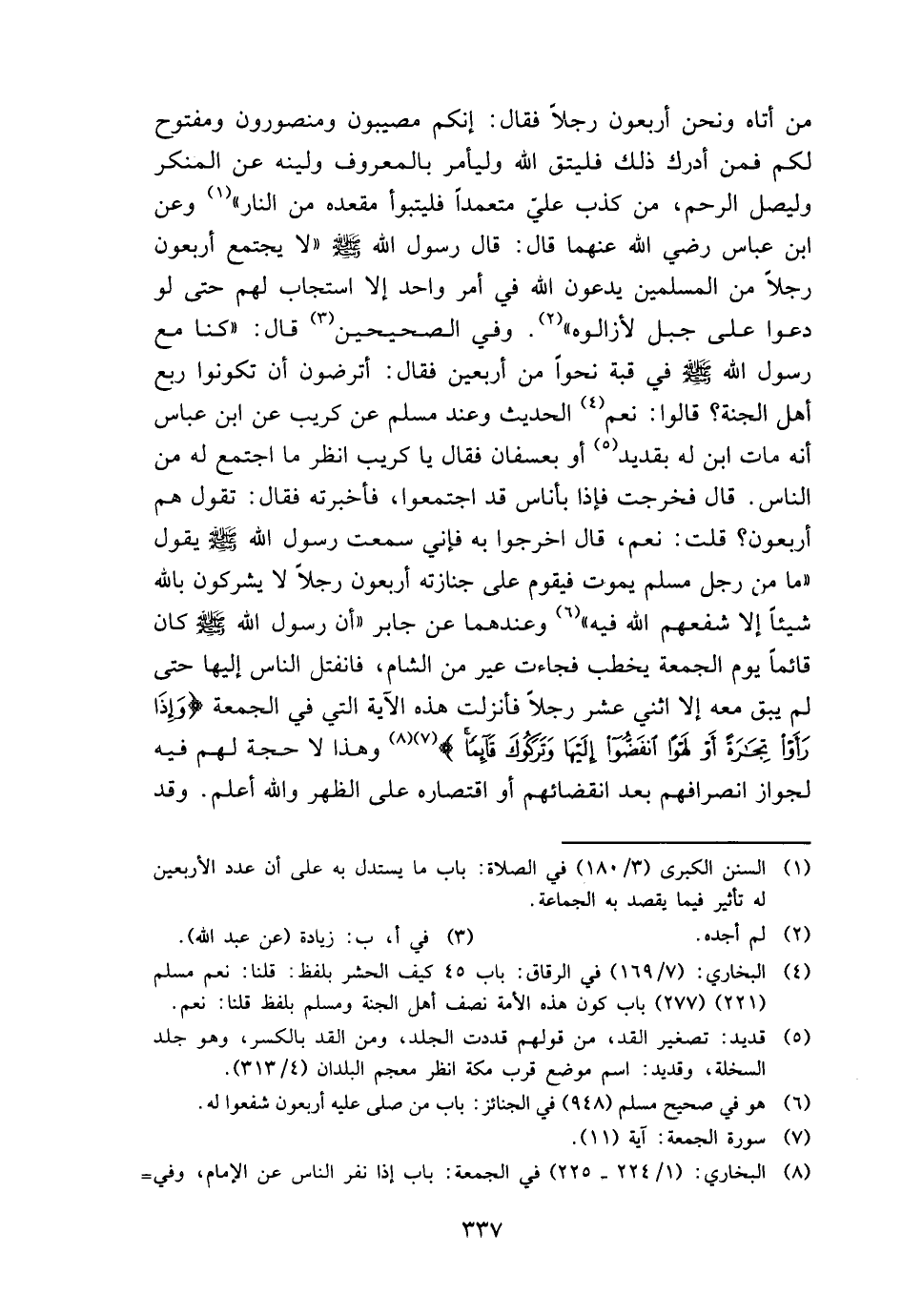 من أَتَاهُ وَنحن أَرْبَعُونَ رجلا فَقَالَ: إِنَّكُم مصيبون ومنصورون ومفتوح لكم فَمن أدْرك ذَلِك فليتق الله وليأمر بِالْمَعْرُوفِ وَلينه عَن الْمُنكر وَليصل الرَّحِم، من كذب عَليّ مُتَعَمدا فَليَتَبَوَّأ مَقْعَده من النَّار " وَعَن ابْن عَبَّاس رَضِي الله عَنْهُمَا قَالَ: قَالَ رَسُول الله - صَلَّى اللَّهُ عَلَيْهِ وَسَلَّم َ - " لَا يجْتَمع أَرْبَعُونَ رجلا من الْمُسلمين يدعونَ الله فِي أَمر وَاحِد إِلَّا اسْتَجَابَ لَهُم حَتَّى لَو دعوا على جبل لأزالوه ". وَفِي الصَّحِيحَيْنِ قَالَ: " كُنَّا مَعَ رَسُول الله - صَلَّى اللَّهُ عَلَيْهِ وَسَلَّم َ - فِي قبَّة نَحوا من أَرْبَعِينَ فَقَالَ: أَتَرْضَوْنَ أَن تَكُونُوا ربع أهل الْجنَّة؟ قَالُوا: نعم الحَدِيث وَعند مُسلم عَن كريب عَن ابْن عَبَّاس أَنه مَاتَ ابْن لَهُ بِقديد أَو أَبُو بعسفان فَقَالَ يَا كريب انْظُر مَا اجْتمع لَهُ من النَّاس. قَالَ فَخرجت فَإِذا بأناس قد اجْتَمعُوا، فَأَخْبَرته فَقَالَ: تَقول هم أَرْبَعُونَ؟ قلت: نعم، قَالَ اخْرُجُوا بِهِ فَإِنِّي سَمِعت رَسُول الله - صَلَّى اللَّهُ عَلَيْهِ وَسَلَّم َ - يَقُول " مَا من رجل مُسلم يَمُوت فَيقوم على جنَازَته أَرْبَعُونَ رجلا لَا يشركُونَ بِاللَّه شَيْئا إِلَّا شفعهم الله فِيهِ " وَعِنْدَهُمَا عَن جَابر " أَن رَسُول الله - صَلَّى اللَّهُ عَلَيْهِ وَسَلَّم َ - كَانَ قَائِما يَوْم الْجُمُعَة يخْطب فَجَاءَت عير من الشَّام، فَانْفَتَلَ النَّاس إِلَيْهَا حَتَّى لم يبْق مَعَه إِلَّا اثْنَي عشر رجلا فأنزلت هَذِه الْآيَة الَّتِي فِي الْجُمُعَة {وَإِذا رَأَوْا تِجَارَة أَو لهوا انْفَضُّوا إِلَيْهَا وَتَرَكُوك قَائِما} وَهَذَا لَا حجَّة لَهُم فِيهِ لجَوَاز انصرافهم بعد انقضائهم أَو اقْتِصَاره على الظّهْر وَالله أعلم. وَقد