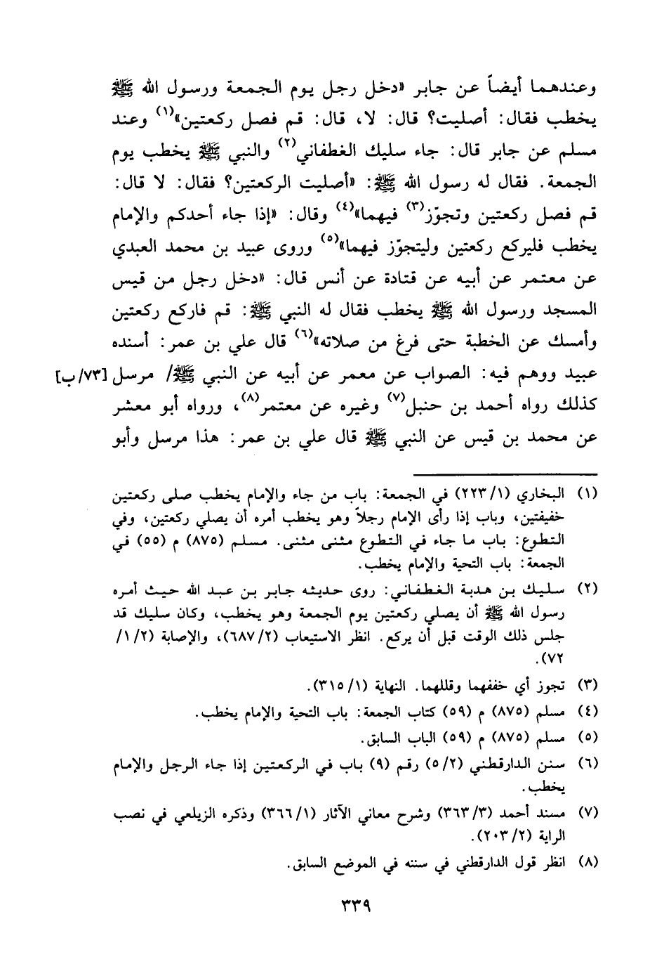 وَعِنْدَهُمَا أَيْضا عَن جَابر " دخل رجل يَوْم الْجُمُعَة وَرَسُول الله - صَلَّى اللَّهُ عَلَيْهِ وَسَلَّم َ - يخْطب فَقَالَ: أصليت؟ قَالَ: لَا، قَالَ: قُم فصل رَكْعَتَيْنِ " وَعند مُسلم عَن جَابر قَالَ: جَاءَ سليك الْغَطَفَانِي وَالنَّبِيّ - صَلَّى اللَّهُ عَلَيْهِ وَسَلَّم َ - يخْطب يَوْم الْجُمُعَة. فَقَالَ لَهُ رَسُول الله - صَلَّى اللَّهُ عَلَيْهِ وَسَلَّم َ -: " أصليت الرَّكْعَتَيْنِ؟ فَقَالَ: لَا قَالَ: قُم فصل رَكْعَتَيْنِ وَتجوز فيهمَا " وَقَالَ: " إِذا جَاءَ أحدكُم وَالْإِمَام يخْطب فليركع رَكْعَتَيْنِ وليتجوز فيهمَا " وروى عبيد بن مُحَمَّد الْعَبْدي عَن مُعْتَمر عَن أَبِيه عَن قَتَادَة عَن أنس قَالَ: " دخل رجل من قيس الْمَسْجِد وَرَسُول الله - صَلَّى اللَّهُ عَلَيْهِ وَسَلَّم َ - يخْطب فَقَالَ لَهُ النَّبِي - صَلَّى اللَّهُ عَلَيْهِ وَسَلَّم َ -: قُم فاركع رَكْعَتَيْنِ وَأمْسك عَن الْخطْبَة حَتَّى فرغ من صلَاته " قَالَ عَليّ بن عمر: أسْندهُ عبيد وَوهم فِيهِ: الصَّوَاب عَن معمر عَن أَبِيه عَن النَّبِي - صَلَّى اللَّهُ عَلَيْهِ وَسَلَّم َ - / مُرْسل كَذَلِك رَوَاهُ أَحْمد بن حَنْبَل وَغَيره عَن مُعْتَمر، وَرَوَاهُ أَبُو معشر عَن مُحَمَّد بن قيس عَن النَّبِي - صَلَّى اللَّهُ عَلَيْهِ وَسَلَّم َ - قَالَ عَليّ بن عمر: هَذَا مُرْسل وَأَبُو