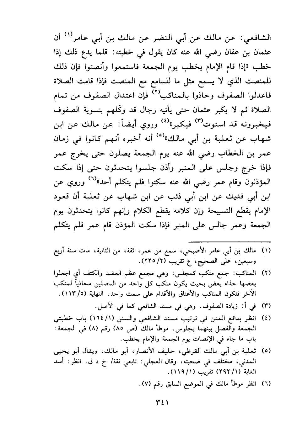 الشَّافِعِي: عَن مَالك عَن أبي النَّضر عَن مَالك بن أبي عَامر أَن عُثْمَان بن عَفَّان رَضِي الله عَنهُ كَانَ يَقُول فِي خطبَته: قَلما يدع ذَلِك إِذا خطب " إِذا قَامَ الإِمَام يخْطب يَوْم الْجُمُعَة فَاسْتَمعُوا وأنصتوا فَإِن ذَلِك للمنصت الَّذِي لَا يسمع مثل مَا للسامع مَعَ المنصت فَإِذا قُمْت الصَّلَاة فاعدلوا الصُّفُوف وحاذوا بالمناكب فَإِن اعْتِدَال الصُّفُوف من تَمام الصَّلَاة ثمَّ لَا يكبر عُثْمَان حَتَّى يَأْتِيهِ رجال قد وَكلهمْ بتسوية الصُّفُوف فيخبرونه قد اسْتَوَت فيكبر " وَرُوِيَ أَيْضا: عَن مَالك عَن ابْن شهَاب عَن ثَعْلَبَة بن أبي مَالك " أَنه أخبرهُ أَنهم كَانُوا فِي زمَان عمر بن الْخطاب رَضِي الله عَنهُ يَوْم الْجُمُعَة يصلونَ حَتَّى يخرج عمر فَإِذا خرج وَجلسَ على الْمِنْبَر وَأذن جَلَسُوا يتحدثون حَتَّى إِذا سكت المؤذنون وَقَامَ عمر رَضِي الله عَنهُ سكتوا فَلم يتَكَلَّم أحد " وَرُوِيَ عَن ابْن أبي فديك عَن ابْن أبي ذِئْب عَن ابْن شهَاب عَن ثَعْلَبَة أَن قعُود الإِمَام يقطع التسبيحة وَإِن كَلَامه يقطع الْكَلَام وَإِنَّهُم كَانُوا يتحدثون يَوْم الْجُمُعَة وَعمر جَالس على الْمِنْبَر فَإِذا سكت الْمُؤَذّن قَامَ عمر فَلم يتَكَلَّم